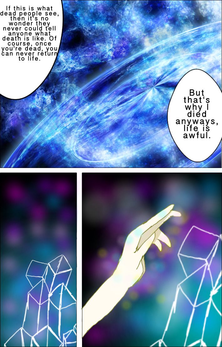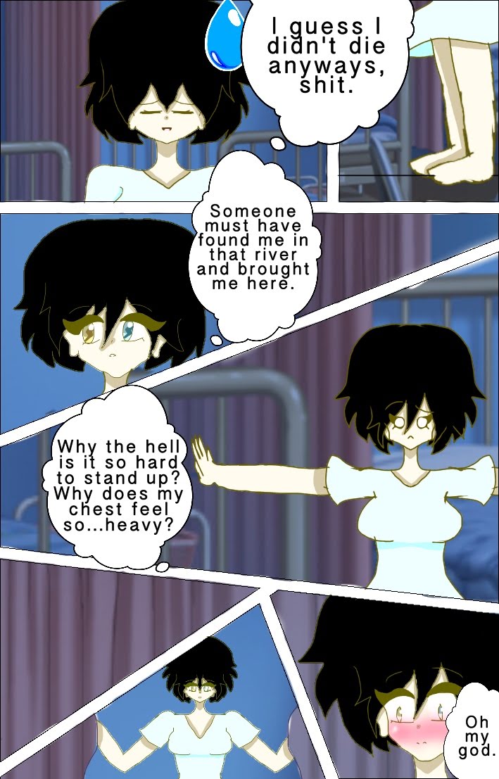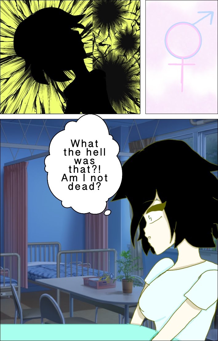 This time we learn about what Satsuki is seeing, but that was kind of an unconscious dream. She wakes up in the hospital, realizing that she's not dead and that someone(Luna) took her to the hospital. She soon explore the hospital room with her "Strange body" (She has a female body, but doesn't realize it) and finds something or someone... in her room.
