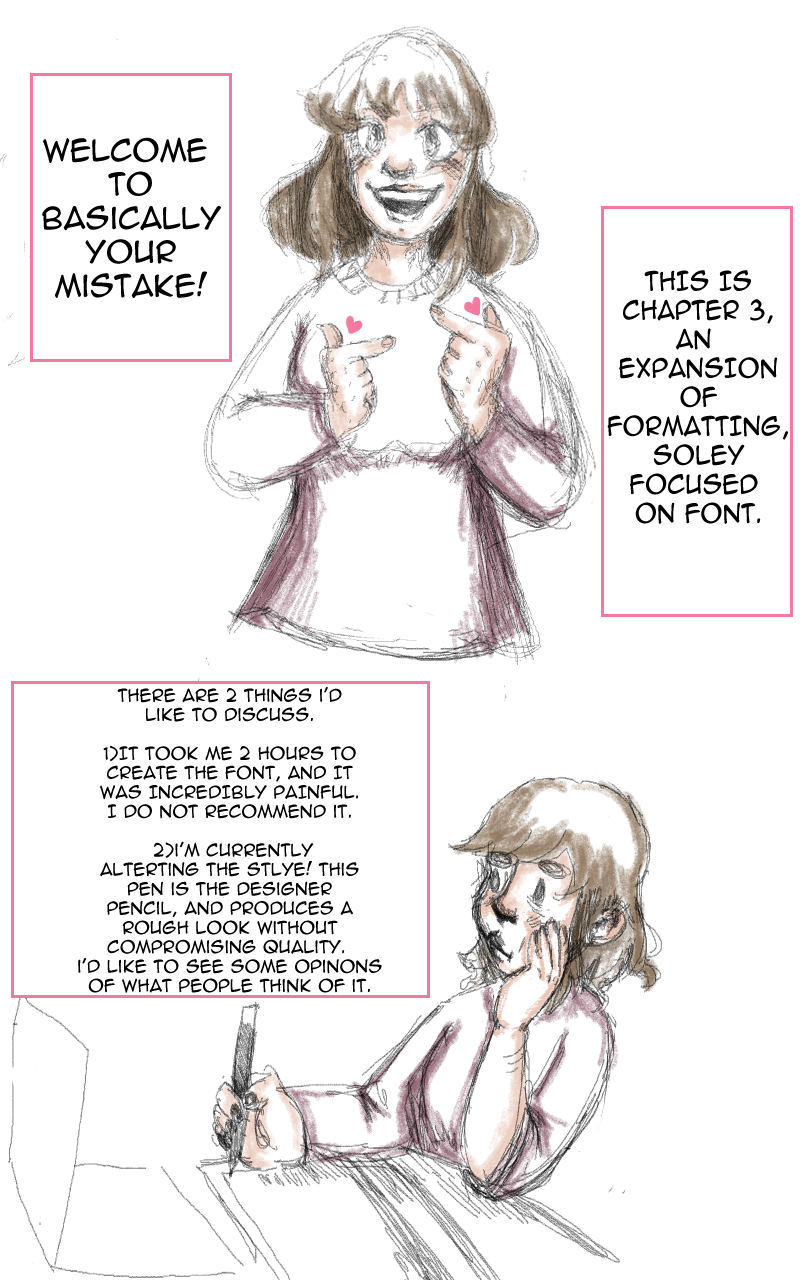 Welcome To Basically Your Mistake! A hopefully daily update on my process to create a new webcomic. Most of my struggles and ideas will be shared in this comic for entertainment/insight, so feel free to judge and help me create something worth reading!