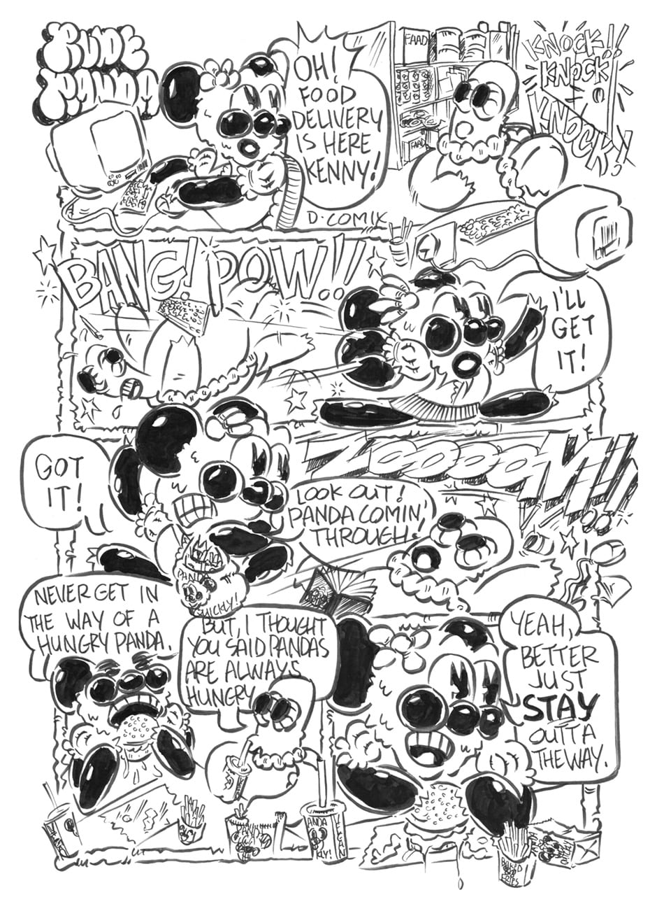Meet Rude Panda! She’s cute, but she IS RUDE !!! Rude Panda lives in the world of FutuRetroistic, but that doesn’t mean she’s there all of the time. This adventurous panda goes where no panda has gone before. You’ve probably seen her. Her graffiti is everywhere. She has photo-bombed some of the most significant moments in history – human and comic. You might see her in your favorite video game. Check out her selfie album. She knows (or has accosted) so many celebrities, you’re sure to see a photo of one of your all-time favorites. Rude Panda is a panda, so she eats all day. That’s why she is such a good cook! And what does she listen to when she’s whipping up her favorite recipes? Her own mixtapes, of course. Maybe one day you’ll be lucky enough to catch Rude Panda on the ones and twos. Just don’t be offended if she makes fun of your clothes. Or your hair. Or your taste in music. Or your driving. Or your cooking. Or your face. You get the idea.