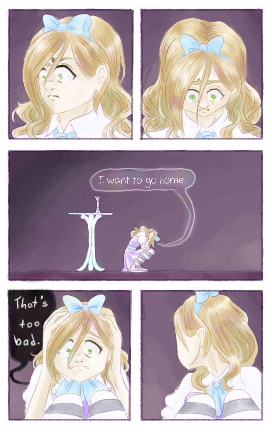 Sometimes Alice feels like she should just disappear- she can barely get through a day at school without having a nervous breakdown. But when she falls head-first into another world, crying in public is the least of her worries. Frogs yelling insults at her, murderous fairy tale villains, and maybe the scariest: talking to new people. How will Alice get through this dream world- and does she even want to return to reality?