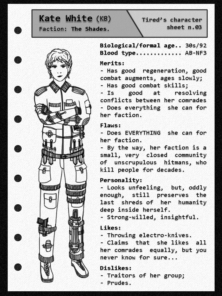 After the collapse of their corporation, the group of eight "Level A officers" (or, basically saying, killers) started to try to survive by themselves. But then, some tragic event had happened. Only five of them remained after it, including Kate (Character sheets for the others will be made in the future, too).
