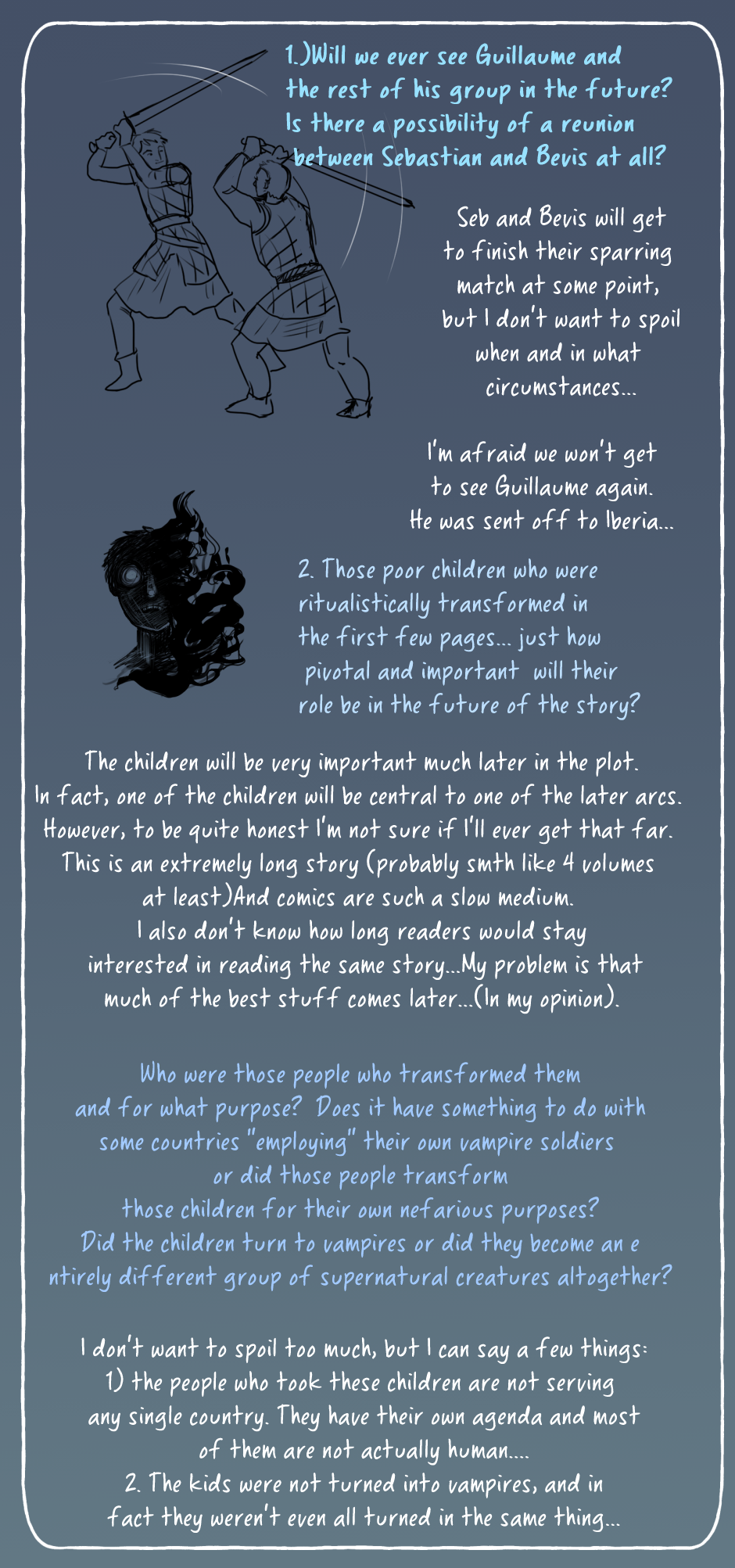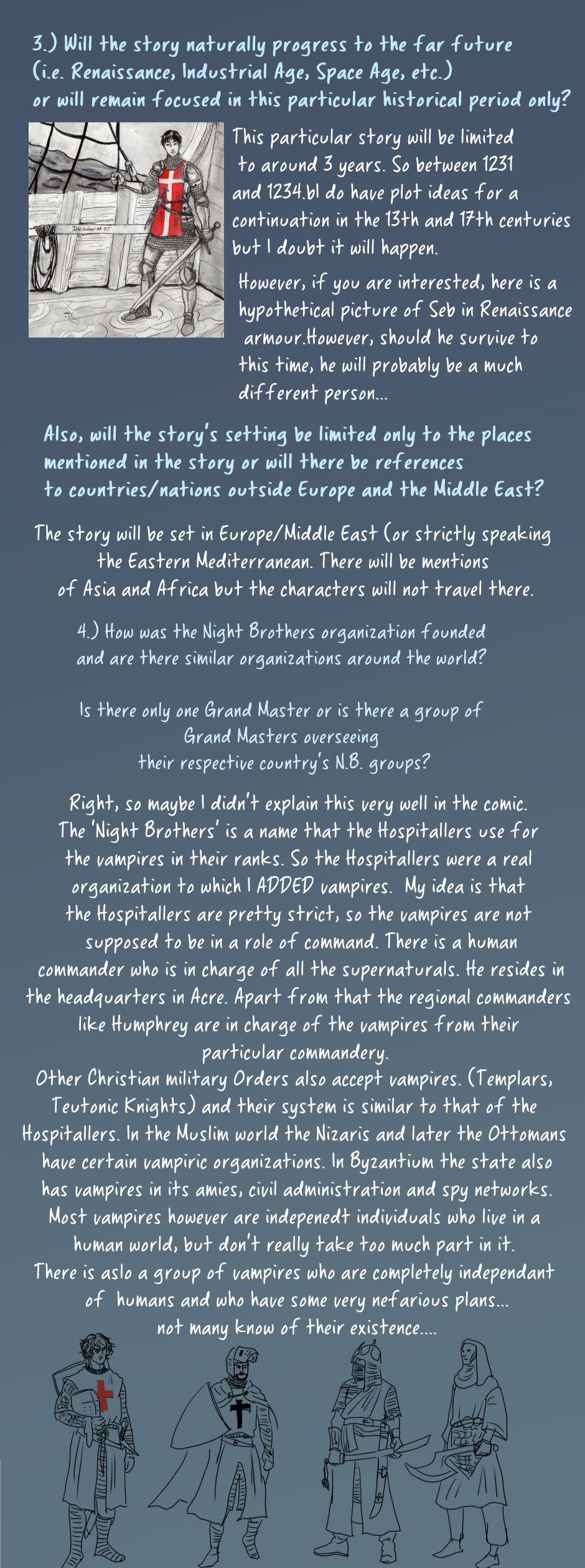 Also, there is a mistake in one of the replies. I meant that I have plans for stories set in the 14th and 17th centuries. (my laptop is pretty slow and the writing options in my graphics program keep lagging so sometimes it's difficult to make corrections!)