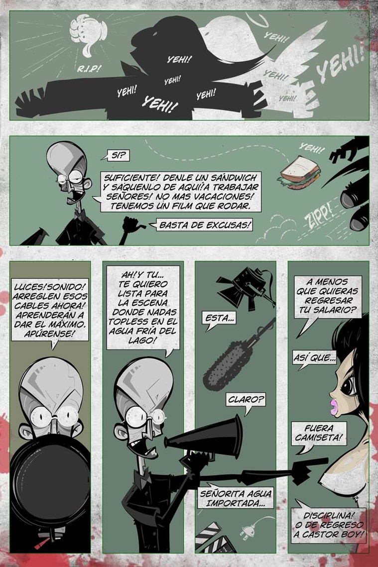 NORMAN 13 ecomic. Narra ¨las bizarras desaventuras¨ de Cuervo Montero, un fracasado actor de Horror ¨B¨Films, venido a menos y encasillado durante su carrera a interpretar el mismo personaje: Norman 13. En la ficción cinematográfica Norman 13 es un monstruo obsesionado con horrorizar y eliminar chicas en bikini que invaden su hogar: Lago Piraña. En la vida real, Norman 13 persigue chicas en bikini para obtener fama, popularidad y de vez en cuando enfrenta a las verdaderas fuerzas del MAL.
