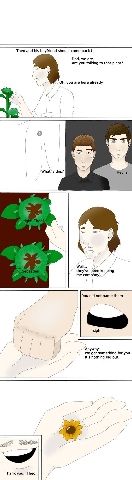 Even flowers need a little company and so does Marcel from time to time. So when Theo isn't around the sunflowers do just fine in listening. And with that he worships the sunflower pin Theo giftet him even more.