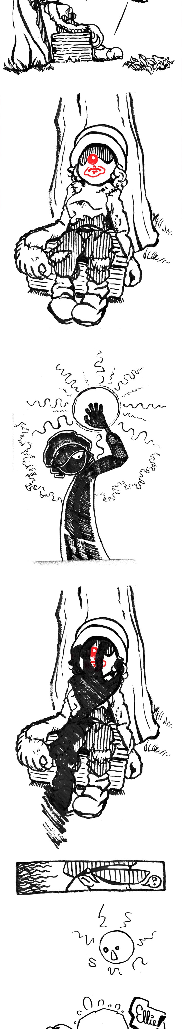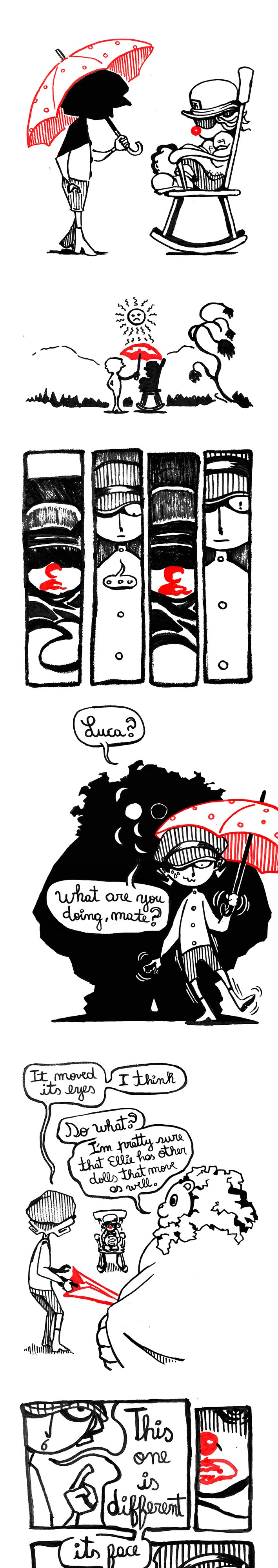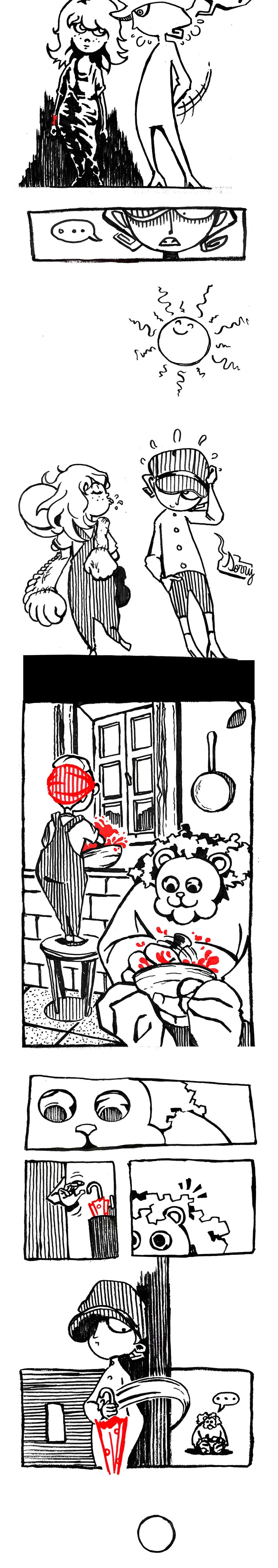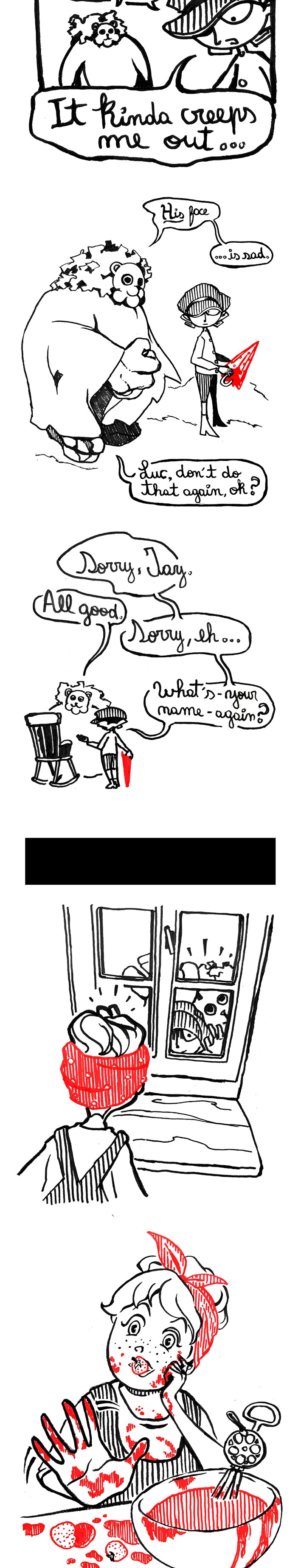 This particular page seems to really emphasize the creepy whimsy of your story, especially the last panel with Ellie. Splendid work, mate! Also, Jary's got some mean yaoi hands!