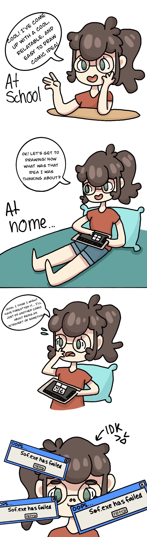 Hello again! sorry I didn't post yesterday. I was trying to figure out a new style. Instead of the usual no line art style and the 4 panel style my past comics have been, I wanted to try making a scrolling comic because that is what gets the most attention on tapas. I also wanted to try a style with line art. As you can see, in the first little part of the comic that is slightly smaller than the rest of the parts, I colored the lines. Maybe next time I will do that for the whole comic, but for now I will stick with black line art.
