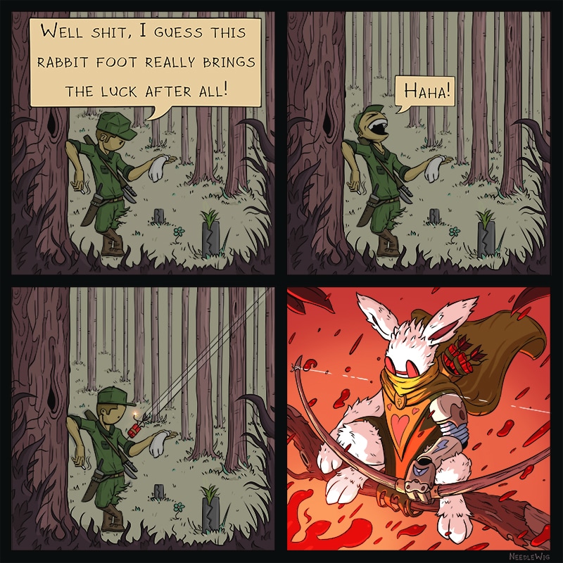 This should be a movie. Also, did the soldier take the rabbit's foot, making him have to get the cyborg leg?