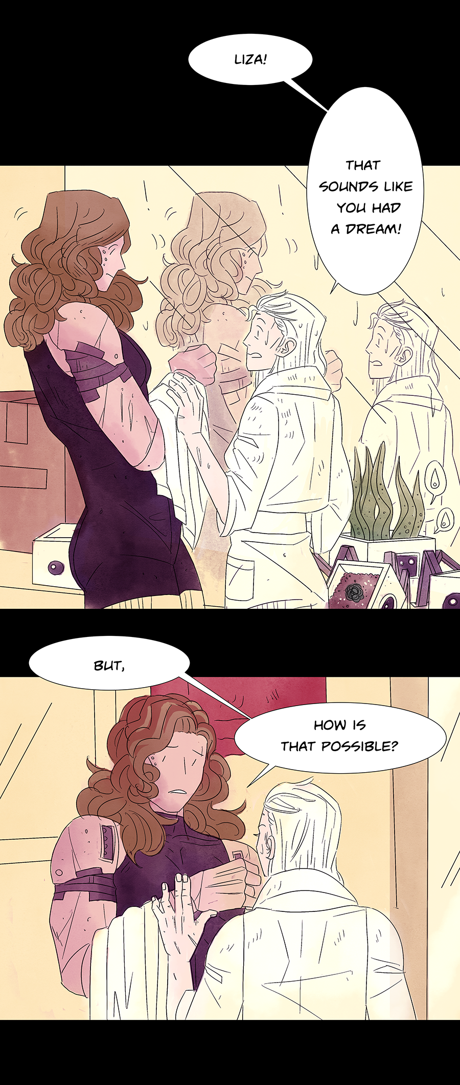 Oh this is so so SO interesting!! A lot happened here ohmygod first off: water the lil robots!!! they r thirsty ;o; secondly: I can't stress how much I love Aarya and Liza thirdly: sHe'S dReAmInG!?!