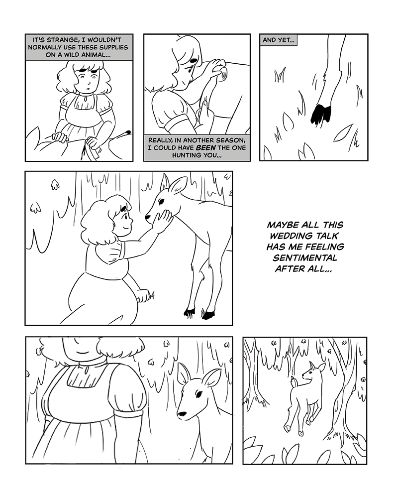 Hunting is fairly rare in Peyton's community, being largely reliant on livestock. It only occurs late fall, and there's a lot of ceremony involved to it when it does occur, usually with some sort of offering to whatever spirits reside in the forest.