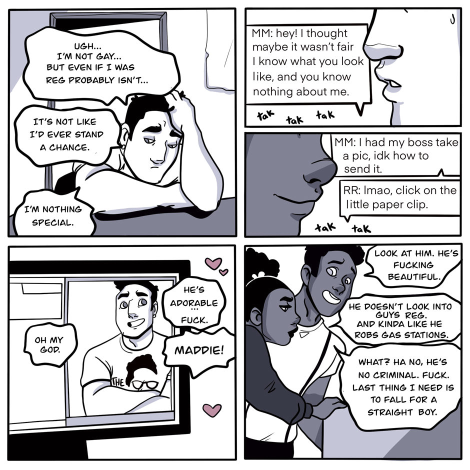 I have made new content for this, I'm just in a very weird headspace with it, as much as I love this comic, looking at it now is really painful. I'm trying to move past that, cuz Mick and Reggie are so very dear to my heart and I want to do them justice, and i feel like if I finish it and make people happy with it, it will help me get over the deep heartbreak it reminds me of, but I guess thank you for bearing with me. I love you all.