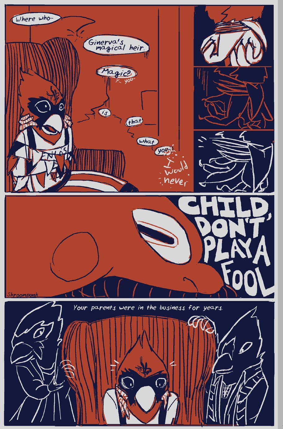 ID: 4 panel comic page. The first panel shows Solomon in his chair. He asks: "Where who–” and Dempsey interrupts with “Ginerva’s magical heir.” Solomon’s speech bubbles become wobbly and uncomfortable. “Magic? Is that what you–I would never.” 2nd panel is a 3 image progression of Solomon trying to break free of his hand bindings. 3rd panel is a close up of Dempsey’s face, showing their sideways octopus pupil. “Child, don’t play a fool.” In the final panel, Dempsey finishes that thought with “Your parents were in the business for years.” Solomon sits in the chair with sketchy visuals of two other cardinals, his parents, on either side of the chair and smiling, like a memory.