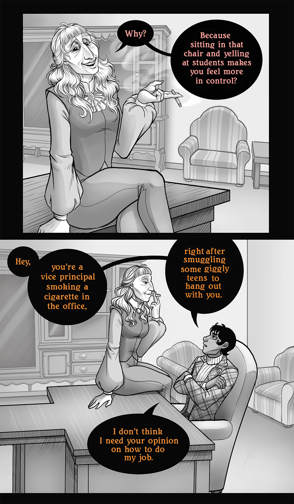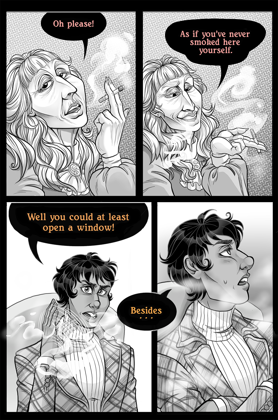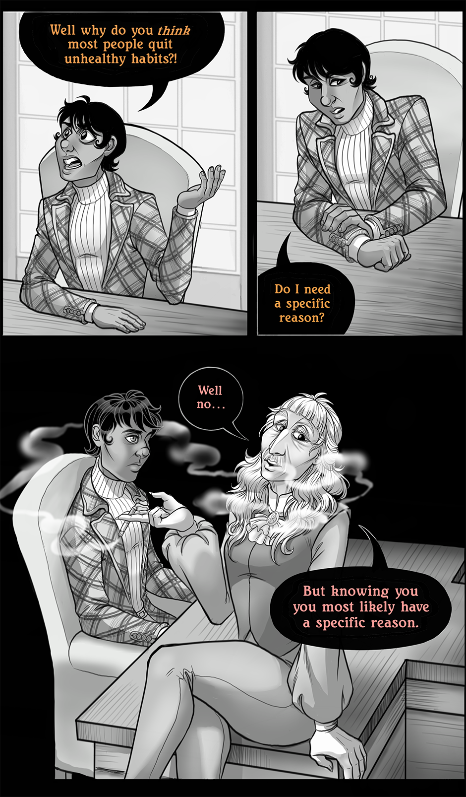 Oh boi, this double update really got me interested! Especially that first one, getting all trippy. And tiny Charlie was absolutely adorable! I can seriously sit and look at all your pages for hours, there are just so many details to take in and I love it!! >u< Very curious about why everything became black and white, it very much seems to have something to do with young Charlie and Tenage Charlie doing something with the remote, although right now I am not sure as to what that means. I want more pages already x'DDD