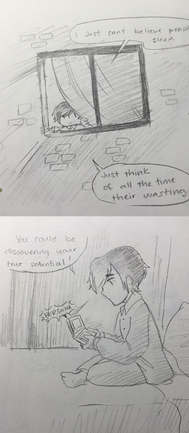 Traditional Comic because I'm lazy! [edit- put the images together] Playing PersonaQ late into the night... morning. Wondering how many apartment residents notice my lights on all night. [An anon questioned why i was up so late. My reasons are very important.]