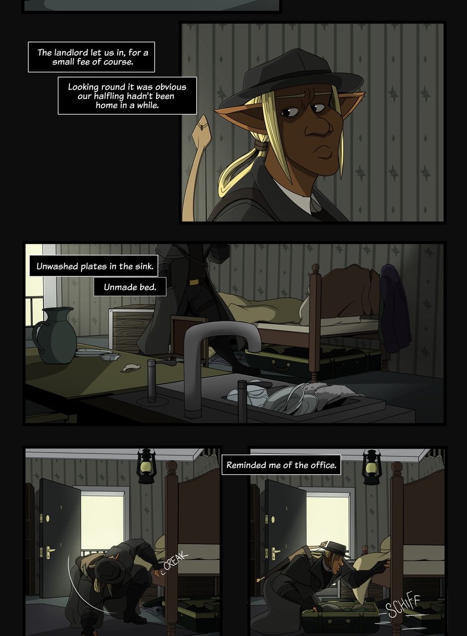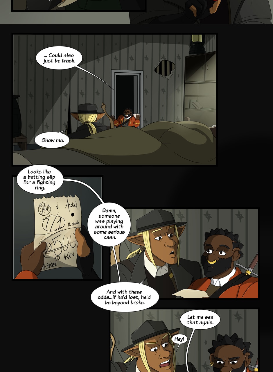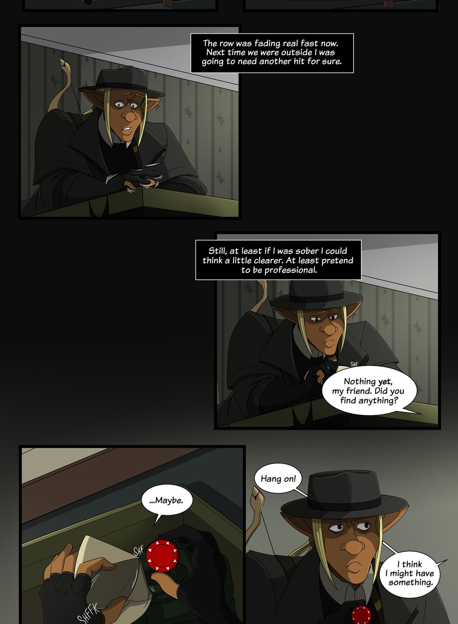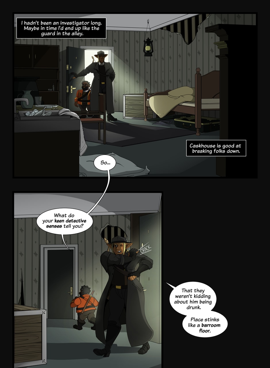 A fantasy-noir about trauma and recovery. The Caskhouse Casefiles follows Bowman, a veteran of a twenty-year war turned private investigator still haunted by his past as he takes on the criminals of Caskhouse, the meanest district in a dirty town. And with gangsters in every corner, assassins on the loose and a very literal femme fatale with her own agenda breathing down his neck it's not going to be easy... Updates Tuesdays and Thursdays.