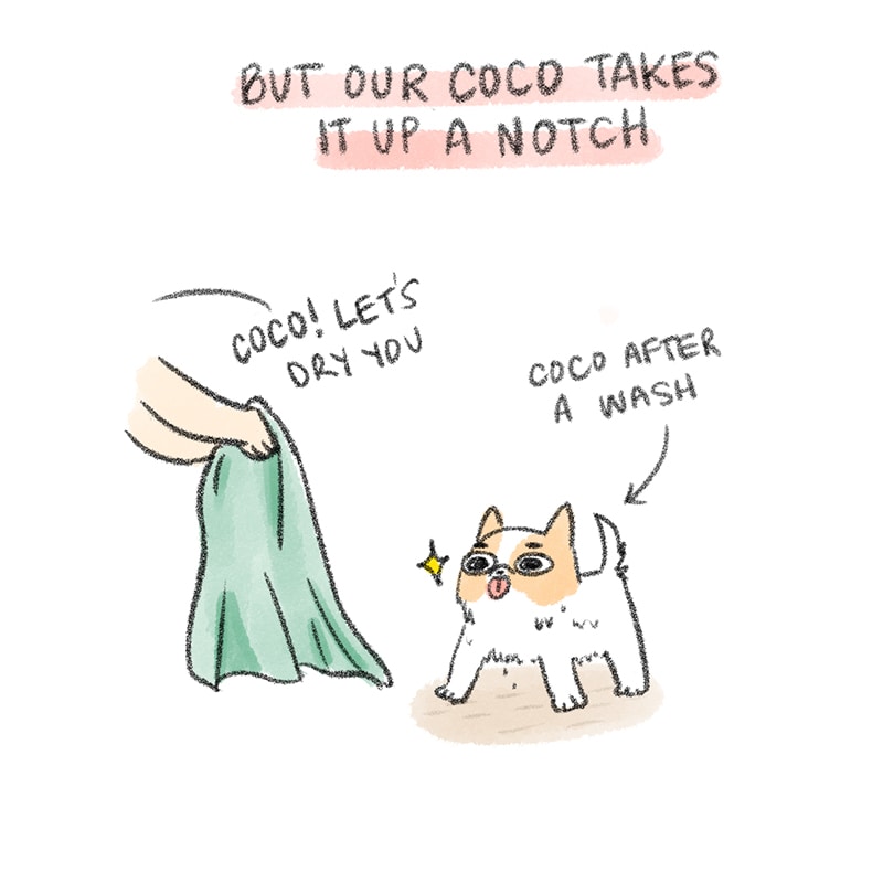 My dog also dryies himself like that... I just leave the towel on the floor for him