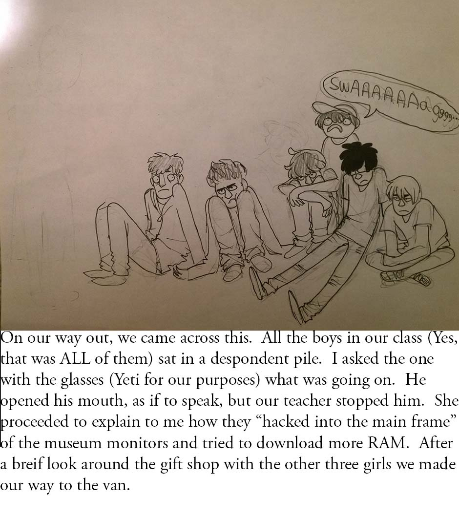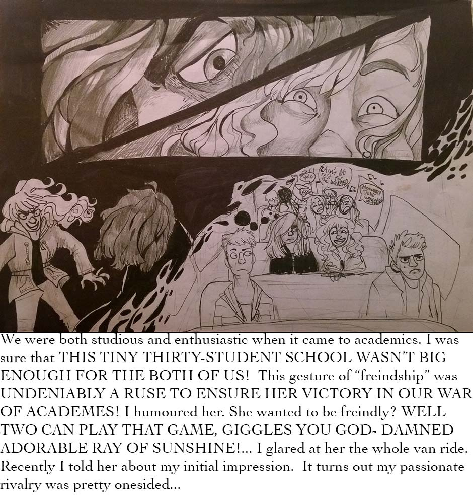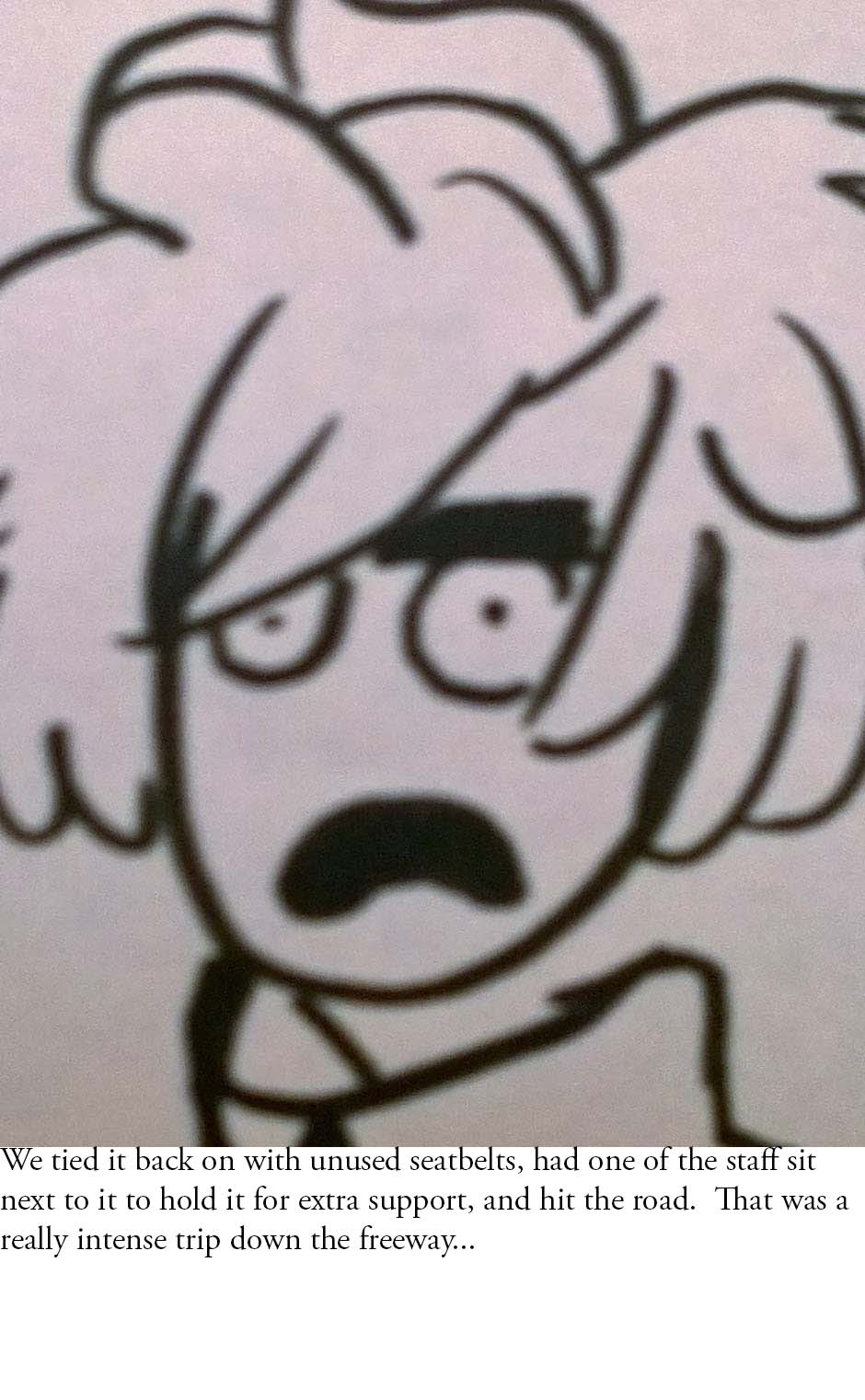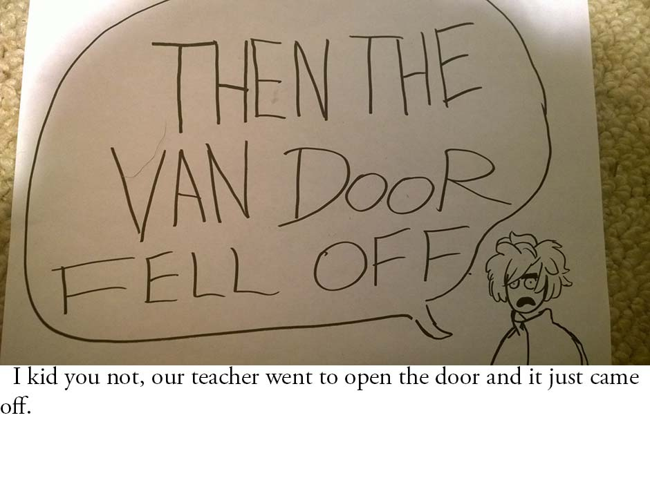 A comic by Bubbles, from her perspective of a event three years ago. Known as, "The DownloadMoreRam.Cam incident" or simply, "That Time the Van Door Fell Off." Famous at our high school two years later. THIS ACTUALLY HAPPENED, I'M NOT JOKING, i don't think there's a better summary of these events then this one so I'm glad we could share it with ya'll. HAVE A GOOD GOD-DAMNED DAY.