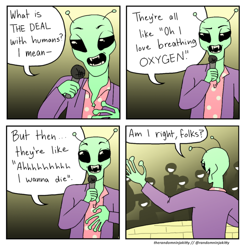 whats the deal with aliens there all like i love breathing hydrogen then there like lets commit genocide on humans and die because the humans somehow win am i right folks