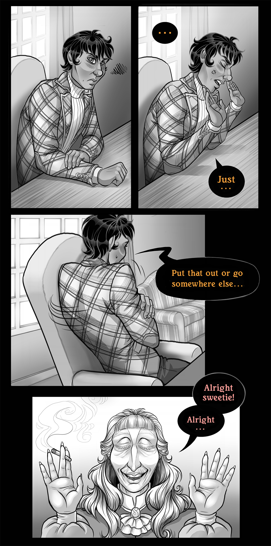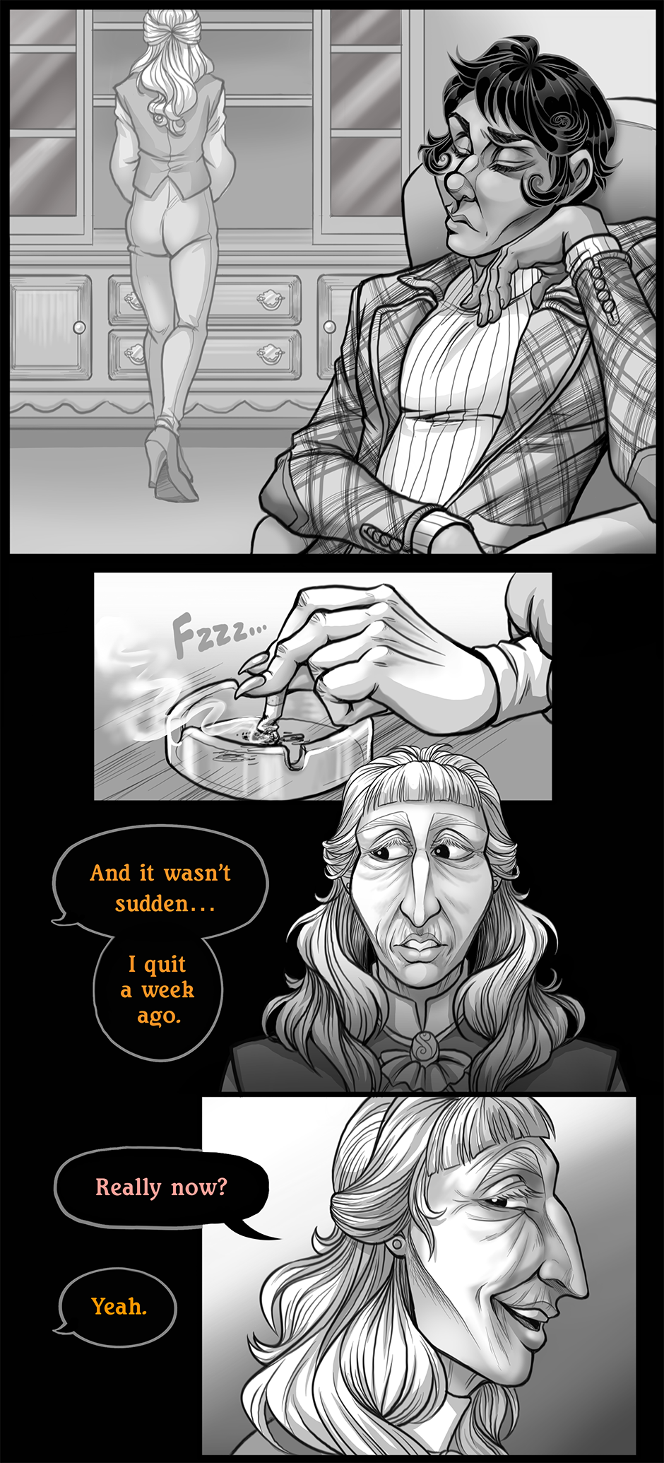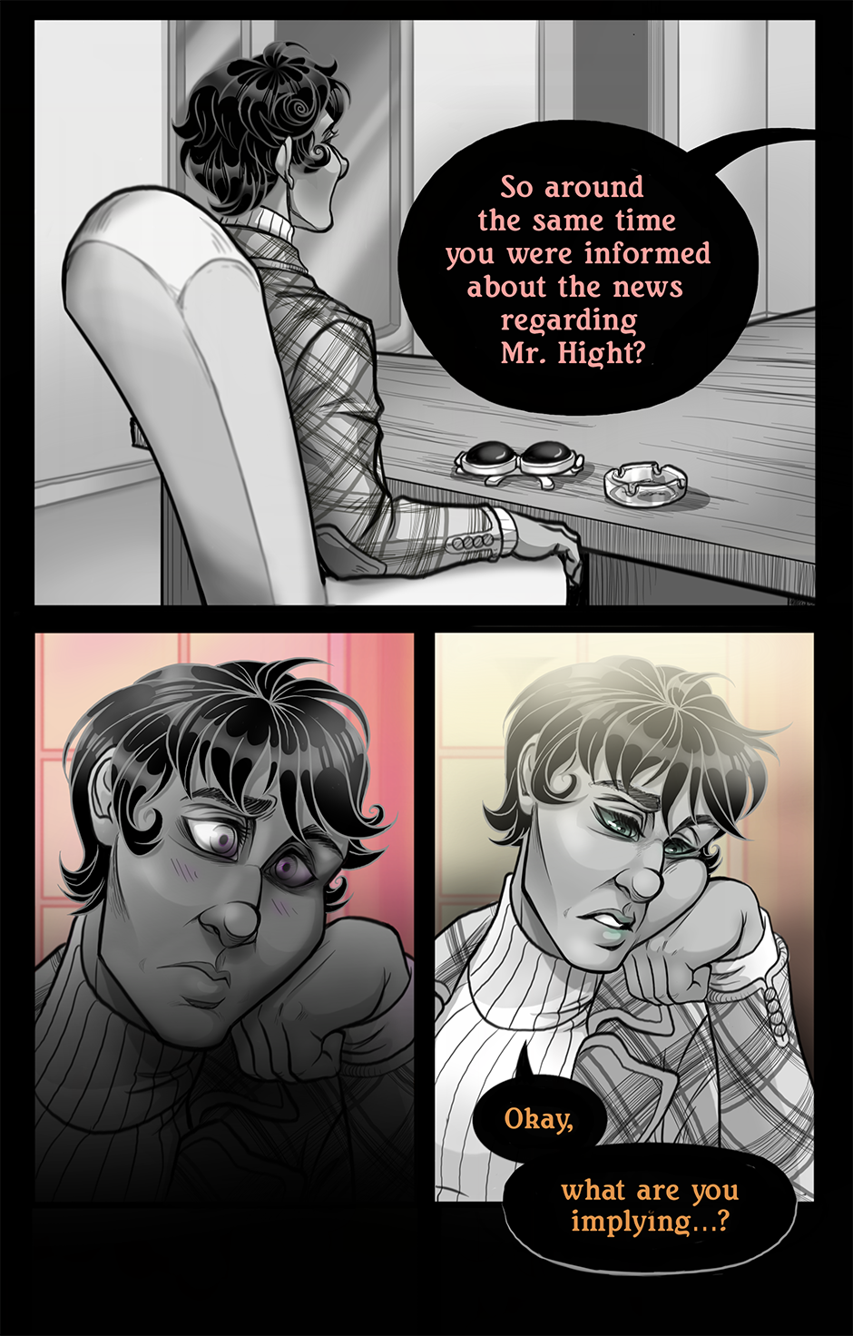 Something I just noticed ! The moment Hight was mentioned we saw some purple hues used in Charlie's eyes, Holden's speech bubble color is the same shade of purple. Plus Hight over reacting to thr mention of Holden's name when teen charlie mentions him Implys that Holden and Hight are both connected in some way. since we know a little more about Charlie's we know his outburst at the teen girls in his office wasn't random its a toned down version of how Hight would react to things charlie would do. So we know these outbursts aren't random there triggered by trauma in some way. Plus its slightly implied that Holden wasn't as great as he seemed. Now my theory is whatever Hight is going to do to charlie will reflect allot of the stuff Holden put him through. Generational trauma if you will. Holden most likely did small things to Hight which blew up as Hight passed his trauma down to charlie. I don't know the specifics bc dame you're good at setting up mysteries! I literally can't think of what Hight could do to charlie to make him end up like this. Like the most I could guess is chalrie got depressed after getting fired but im pretty sure that's not where the terrible shit starts yet. But hey thats just a theory! A COMIC THEORY AAAAAAAAaaaaaaaaaand cut