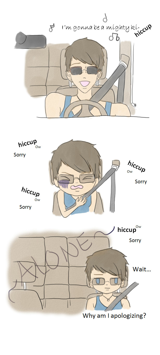 So this happened a few weeks ago on my drive back to my parents. As an explanation, my hiccups sound very similar to a chihuahua being stepped on or, as my friends call it, a dinosaur summoning her babies. It makes my friends laugh and drives my mother insane so I've gotten into the habit of trying to keep them quiet (which hurts) and apologizing since they get annoying after a minute or so. Thing is, I was totally alone in the car so I turned up my music and hiccuped as loud as I wanted!