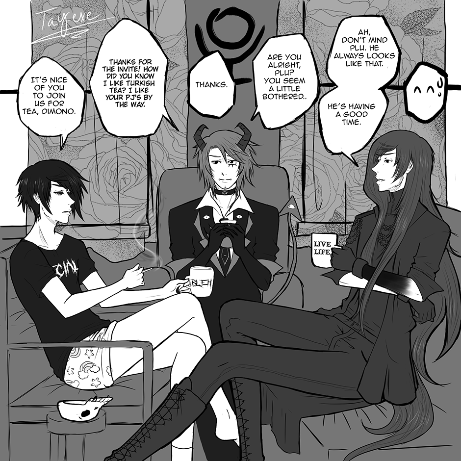 ©Tay.exe Just a single panel of my bb's Pluto and Death having tea with another artist's oc Dimono (ig: @silwarai) Want your oc to have tea with mine? Hit me up xD maybe Pluto will be in the mood to have guests over. Follow me on ig: @Tayexe