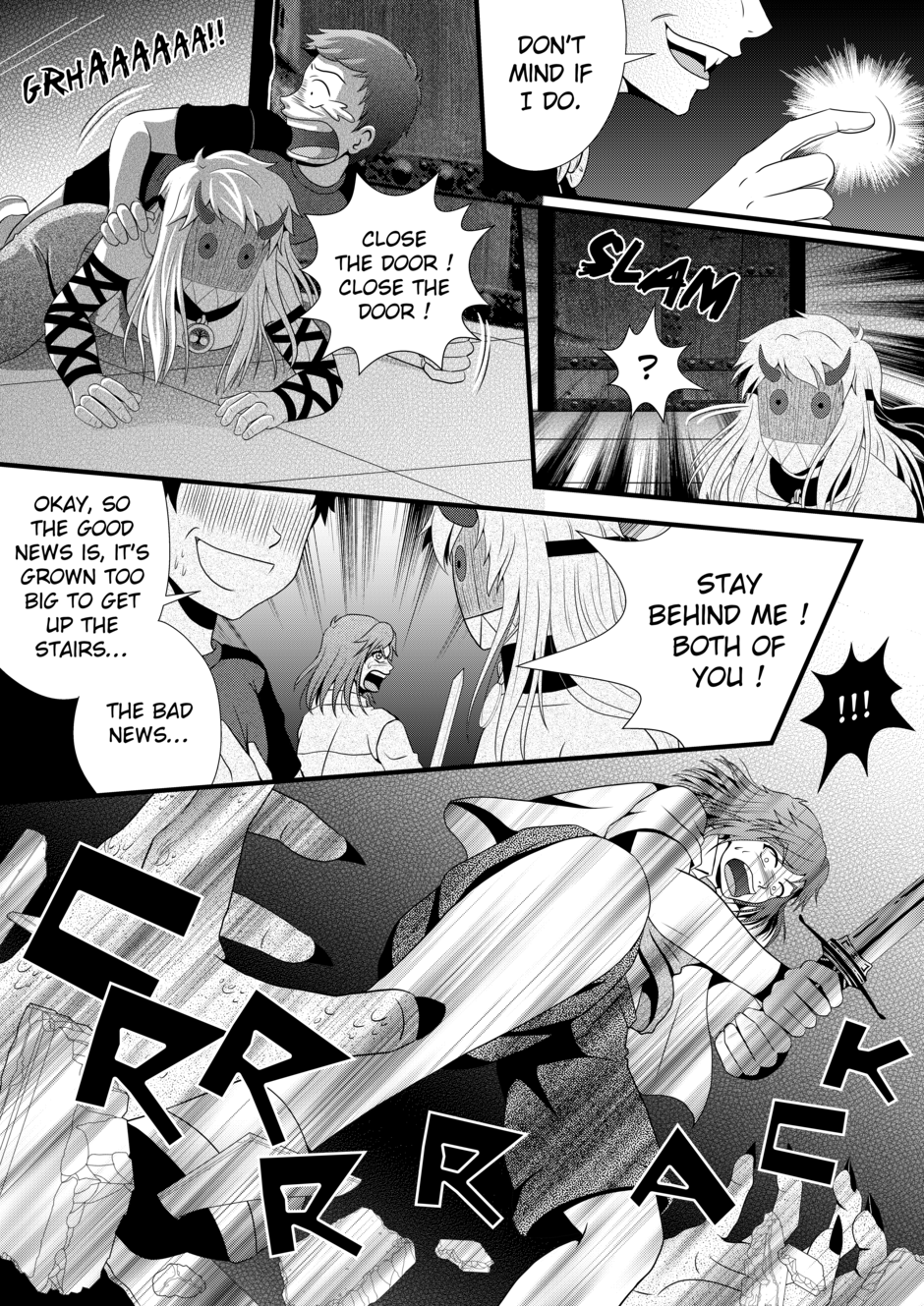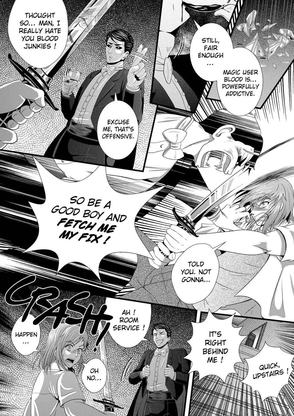Oh heck!! I love that fourth panel with the open jaws and all, good h e c k. The story of a blood addicted vampire, ah, those never end well. Question, couldn't they just throw the coin at the leprechaun and be done with it? xD