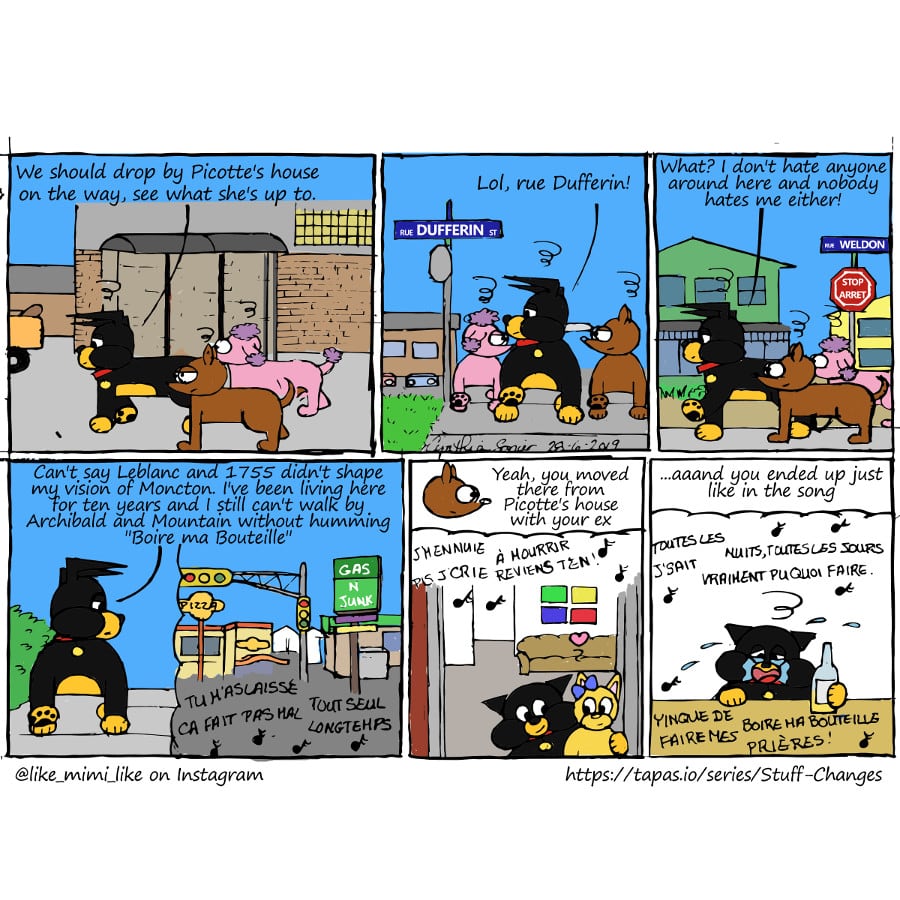 They were the first wave of acadian modernity; distinctively acadian, yet obviously influenced by popular culture, their stories happened in cities rather than on coastal fishing villages, embraced chiac instead of standard french...a bit like I blend acadian stories, slang, places with the satire and art my own generation grew up watching on TV (Simpsons, South Park, Family Guy, King of the Hill...)