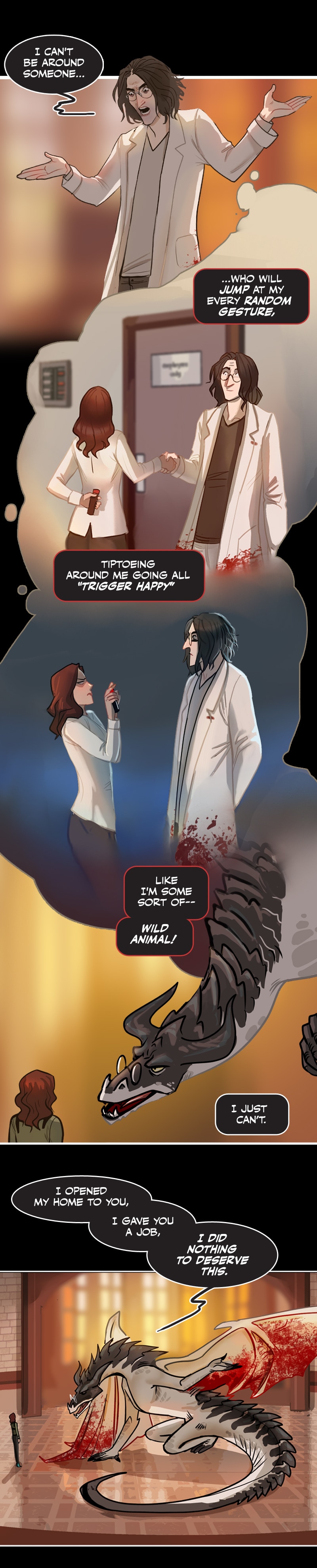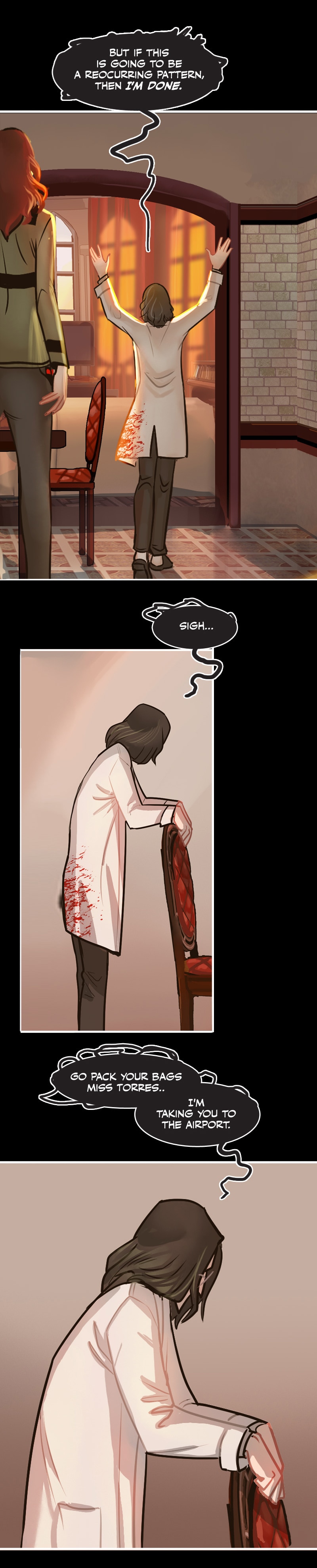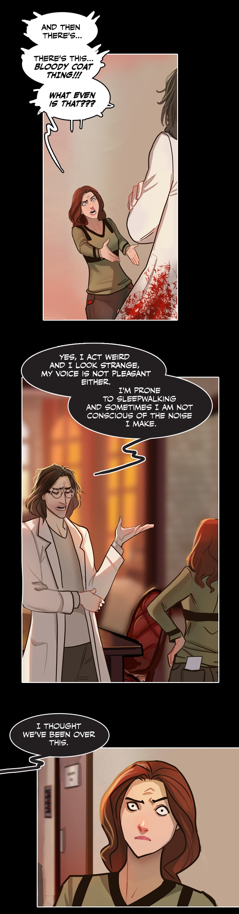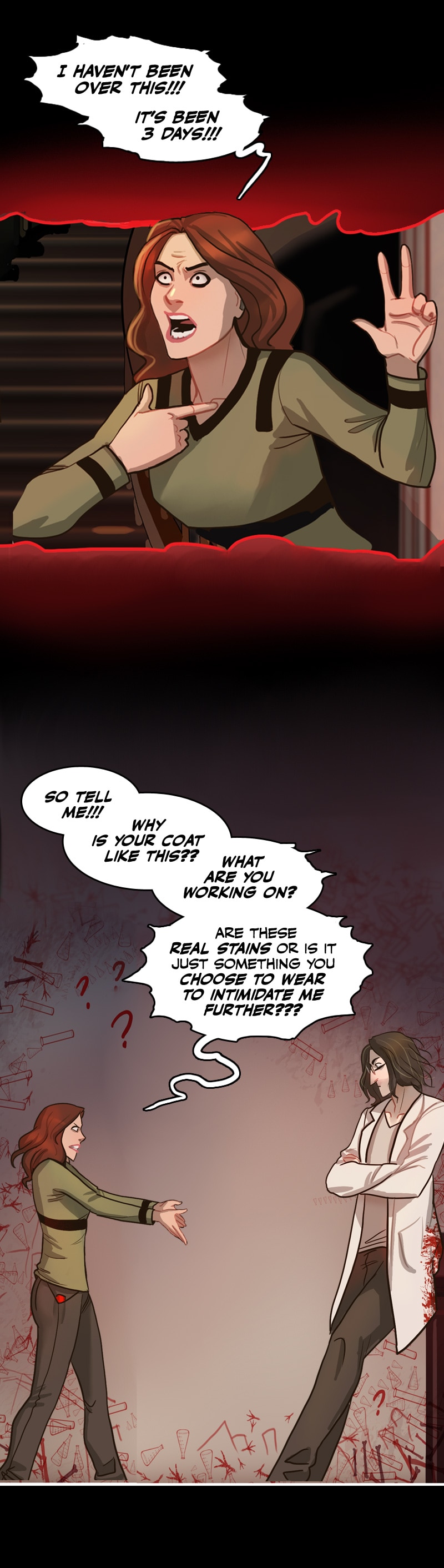 I have gathered enough clues in the comic that I decided long ago they aren't blood stains but instead are ketchup stains from his ketchup addiction and every coat has permanent stains. Ketchup is really hard to get out of white clothing. He probably quit trying long ago because he's a klutzy slob. 😆