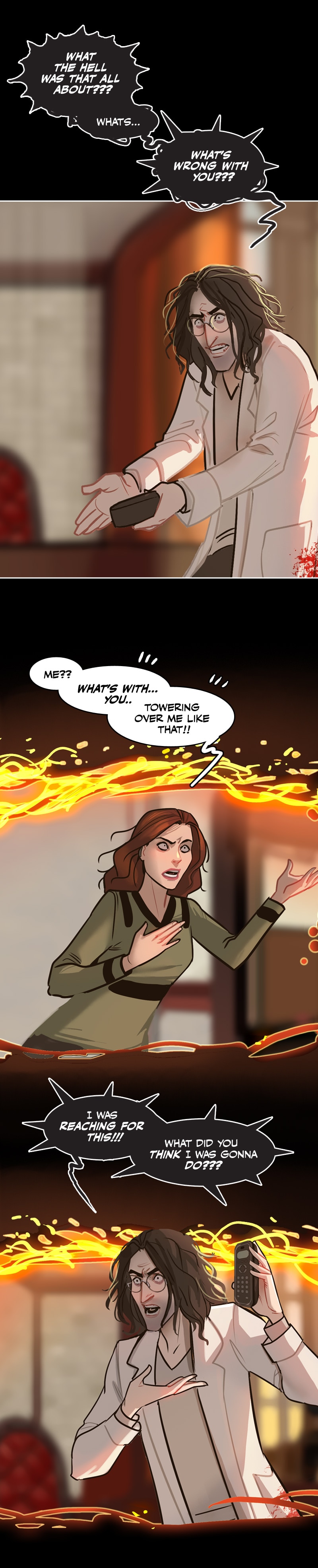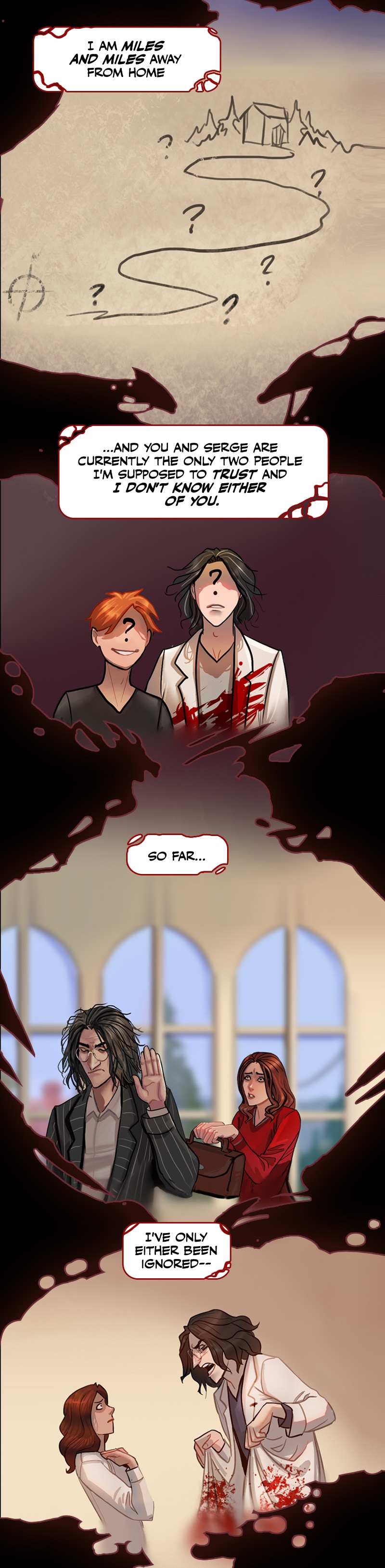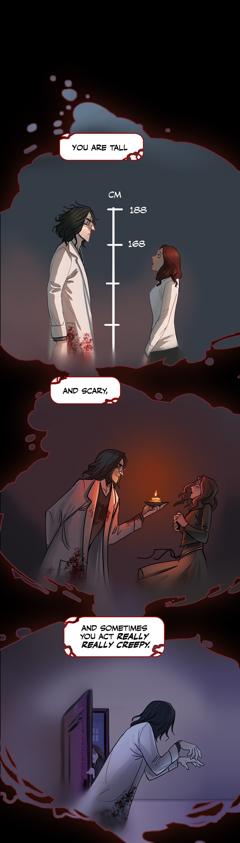 I have gathered enough clues in the comic that I decided long ago they aren't blood stains but instead are ketchup stains from his ketchup addiction and every coat has permanent stains. Ketchup is really hard to get out of white clothing. He probably quit trying long ago because he's a klutzy slob. 😆