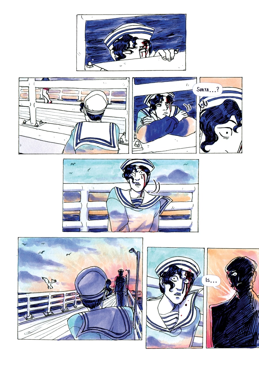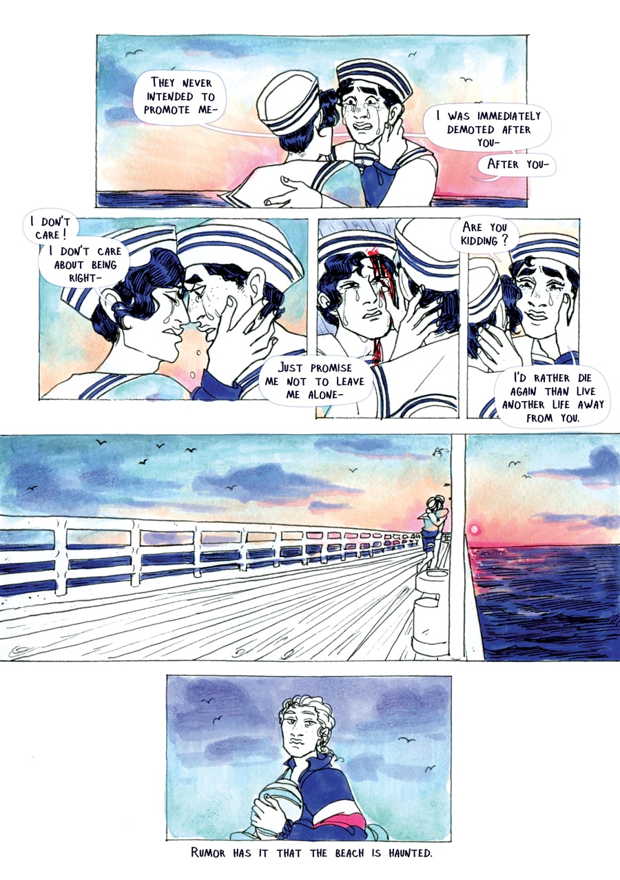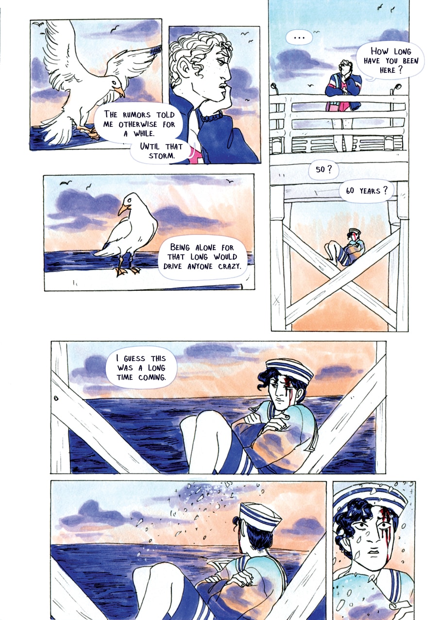 People say that the beach is haunted, and that it has been for a while now. Some say they spotted 'him' on the pier, others ankle deep into the icy cold water; in the middle of a stormy night on the boardwalk, or in the noisy crowd of beach-goers, seemingly unseen by others. A sailor with no boat, and nothing to his name but the clothes on his back and this strange, surreal sweater that mirrors the state of the sea.