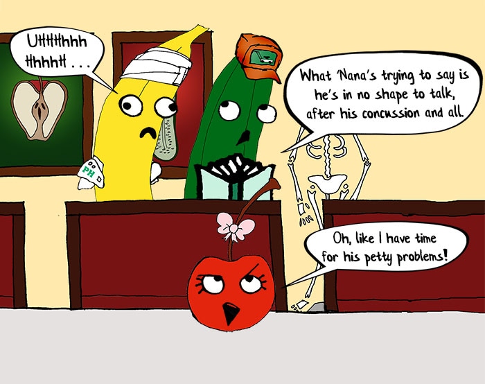 Banana has a head wound and Cherry hates Pear's makeover