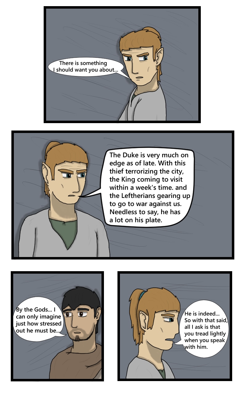 Geliard meets the Duke's hand and learns information about the situation that the city has been left in.