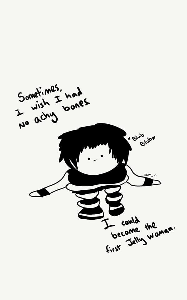 Gish has a disability called Ehlers-Danlos Syndrome, a genetic disorder that causes the body to have faulty collagen (which is EVERYWHERE. Gish's joints and digestive system are majorly affected causing widespread pain.), along with a handful of the rare conditions that go along with it; these include but are not limited to P.O.T.S. and Interstitial Cystitis. With the help of Sizlak, they approach this horrible combination of genetic diseases with a little humor in doodle format.