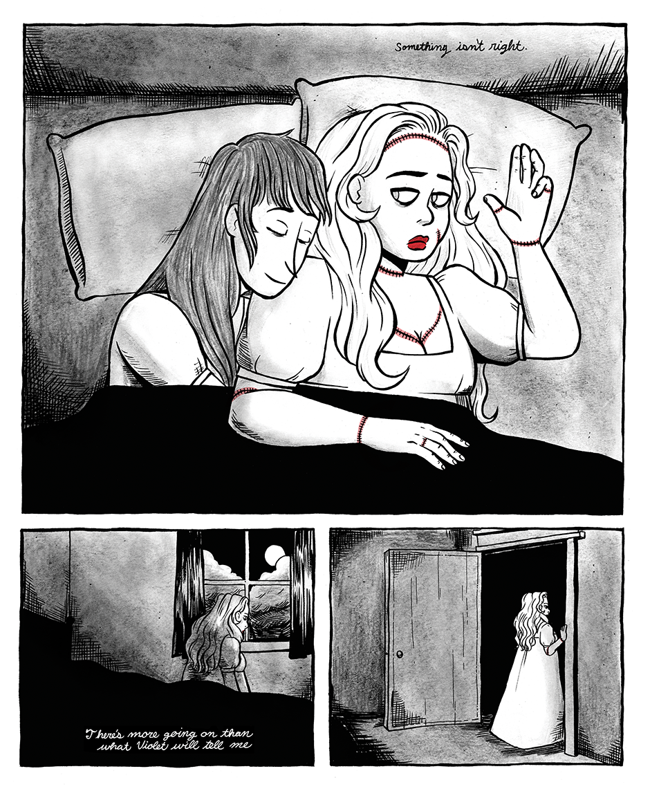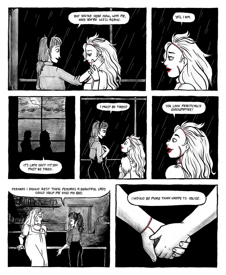 The Prometheite is a graphic novella reimagining Mary Shelley's Frankenstein as a lesbian tragedy. It follows the romance between Violet Schweitzer and Aveline Clerval, two young women in 19th century Ingolstadt.