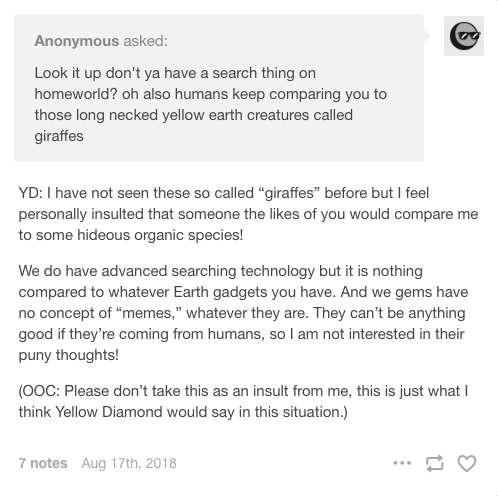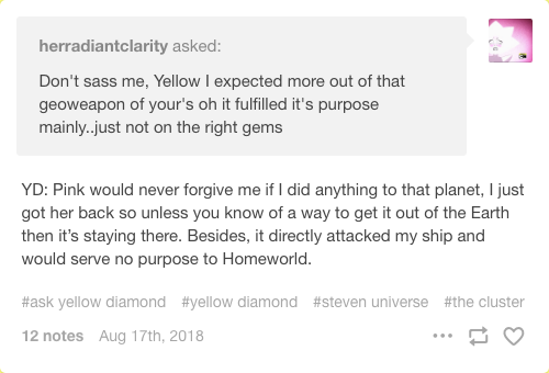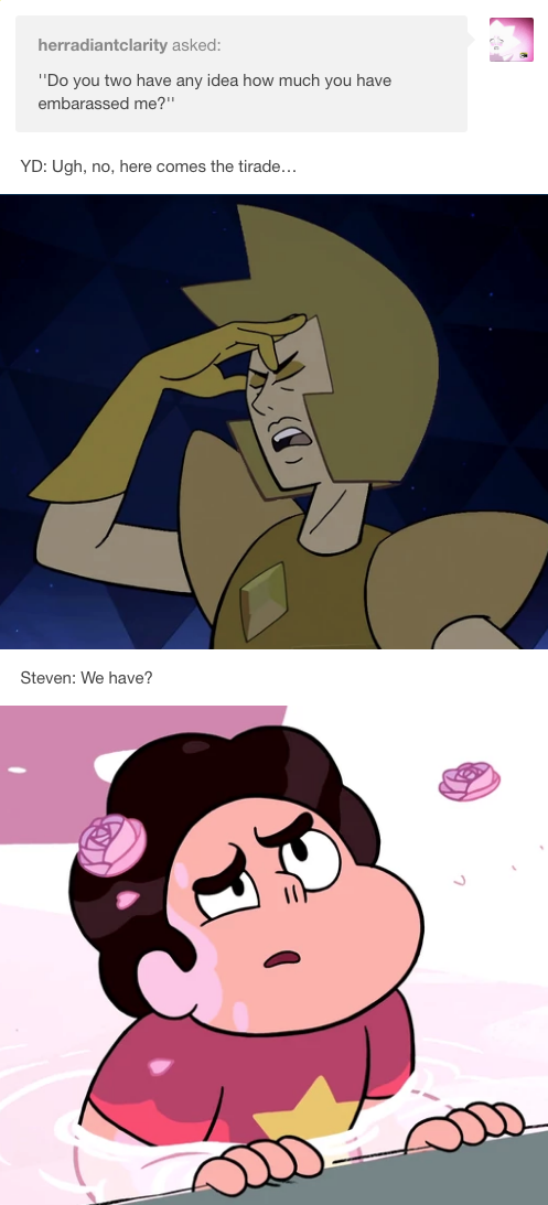 Who is speaking on the Diamond line? I'll take it from here. No longer working at the Big Donut. Full time intergalactic matriarch. Canon up to Familiar (and up to the very end of Together Alone) but may contain elements from future episodes and movie content. Posted originally on Tumblr.