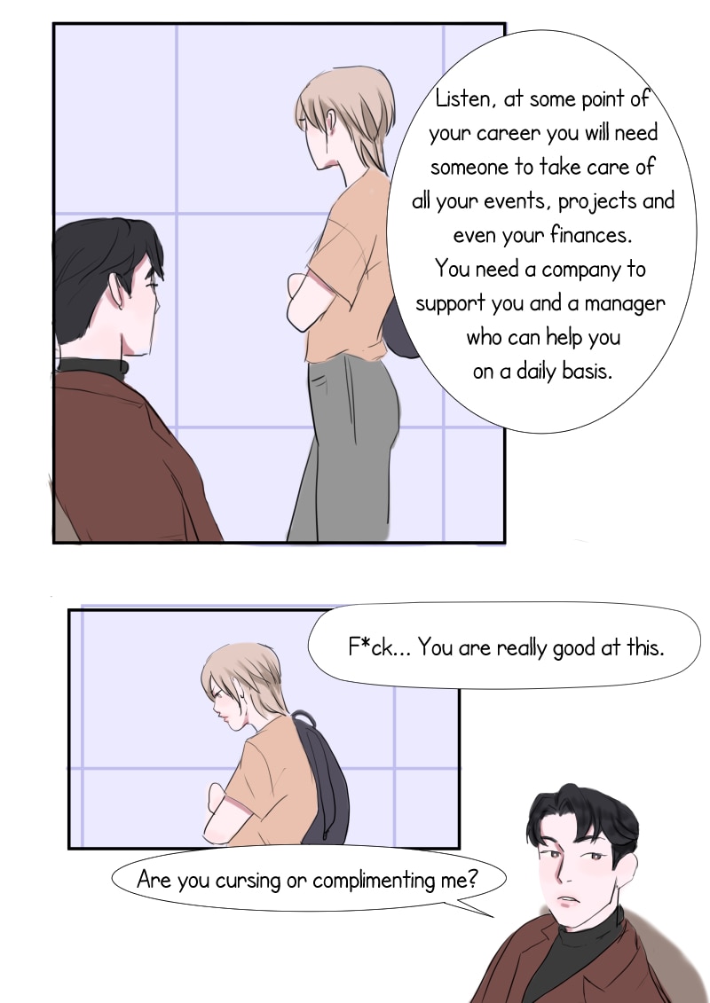 Hi I’ve noticed that the speech bubbles of the manager are perfectly round and the speech bubbles of the model are drawn by hand. Is that a stylistic choice? Does that mean anything? Love your art by the way 😁😁