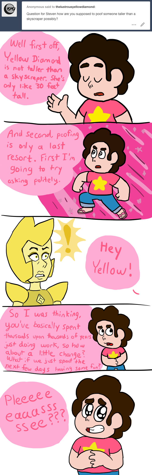 Who is speaking on the Diamond line? I'll take it from here. No longer working at the Big Donut. Full time intergalactic matriarch. Canon up to Familiar (and up to the very end of Together Alone) but may contain elements from future episodes and movie content. Posted originally on Tumblr.