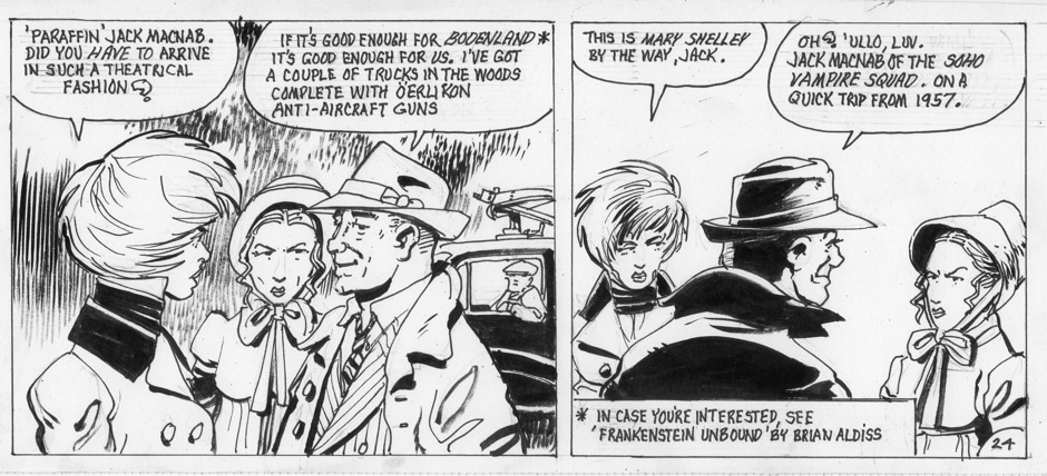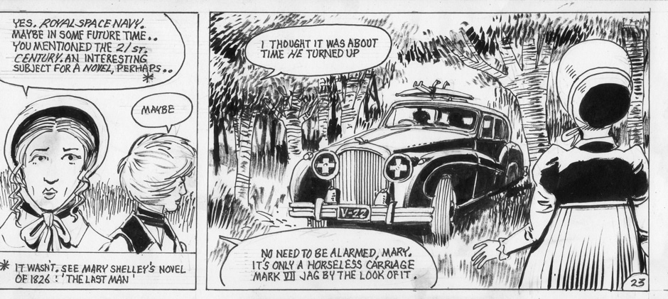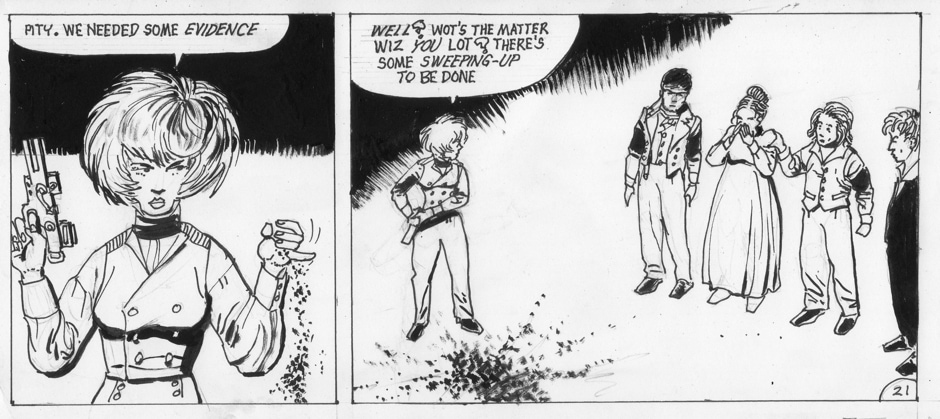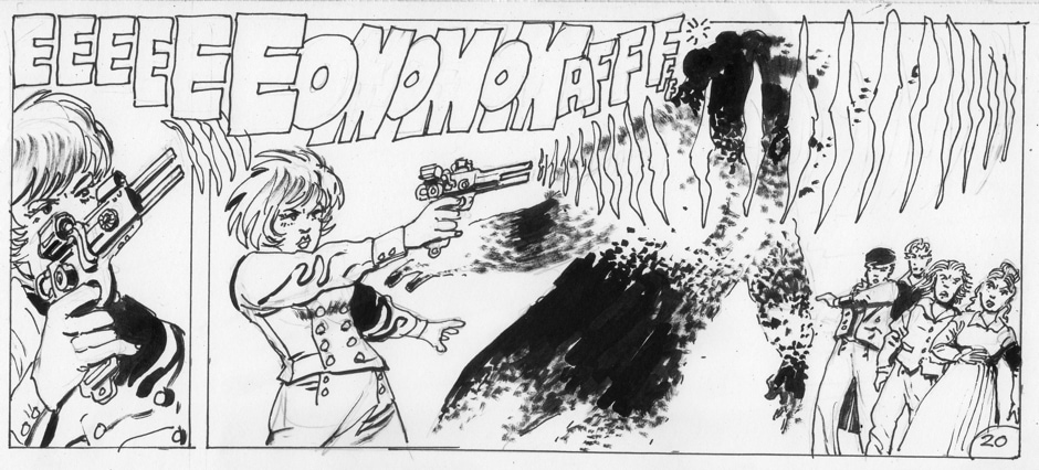 On occasion, she has been accompanied by a human-sized “Muffin the Mule” entity which had its origins in a strip Keith did for IPC’s Revolver many years ago. Her stories are written and drawn by Keith Page, sometimes also by Stephen Walsh.