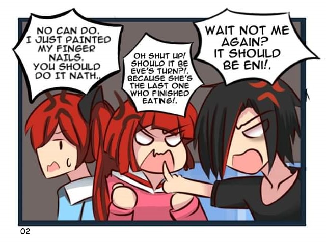 Dishes! Who's gonna do 'em? Featuring Eni, Eve, Nath, and Sam By: Scheifuu