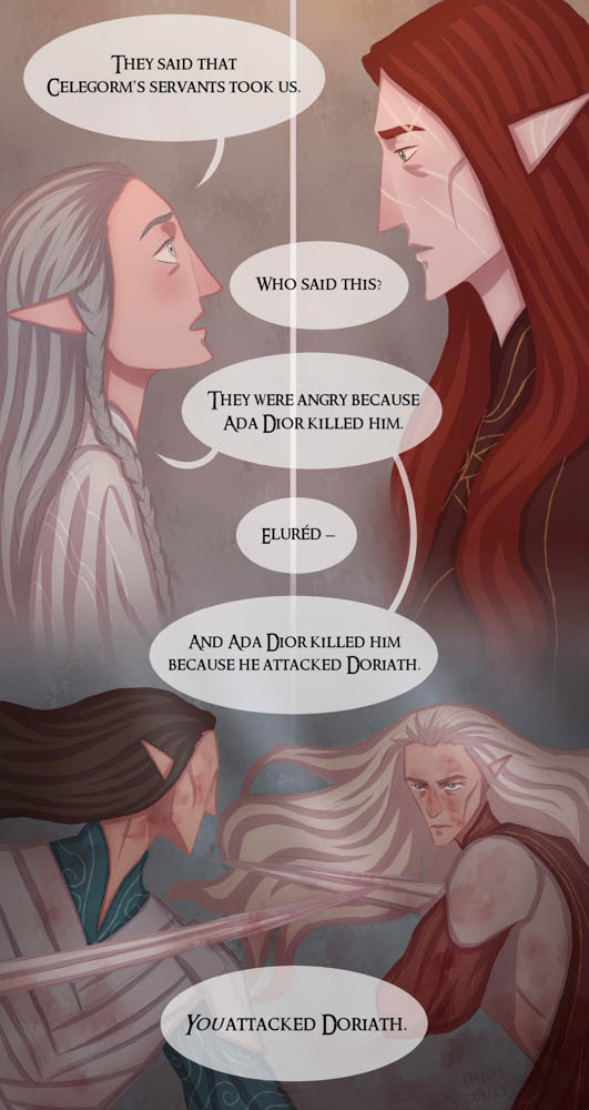 Well, I guess Maedhros didn't have to say much lol In the previous installment (which has not been drawn yet), the twins overhear of what happened from a (currently) anonymous source, but still don't know all the details.