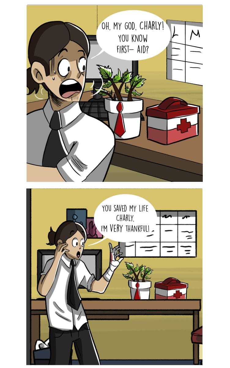 Charly's skills includes first-aid. Who could've guessed it?