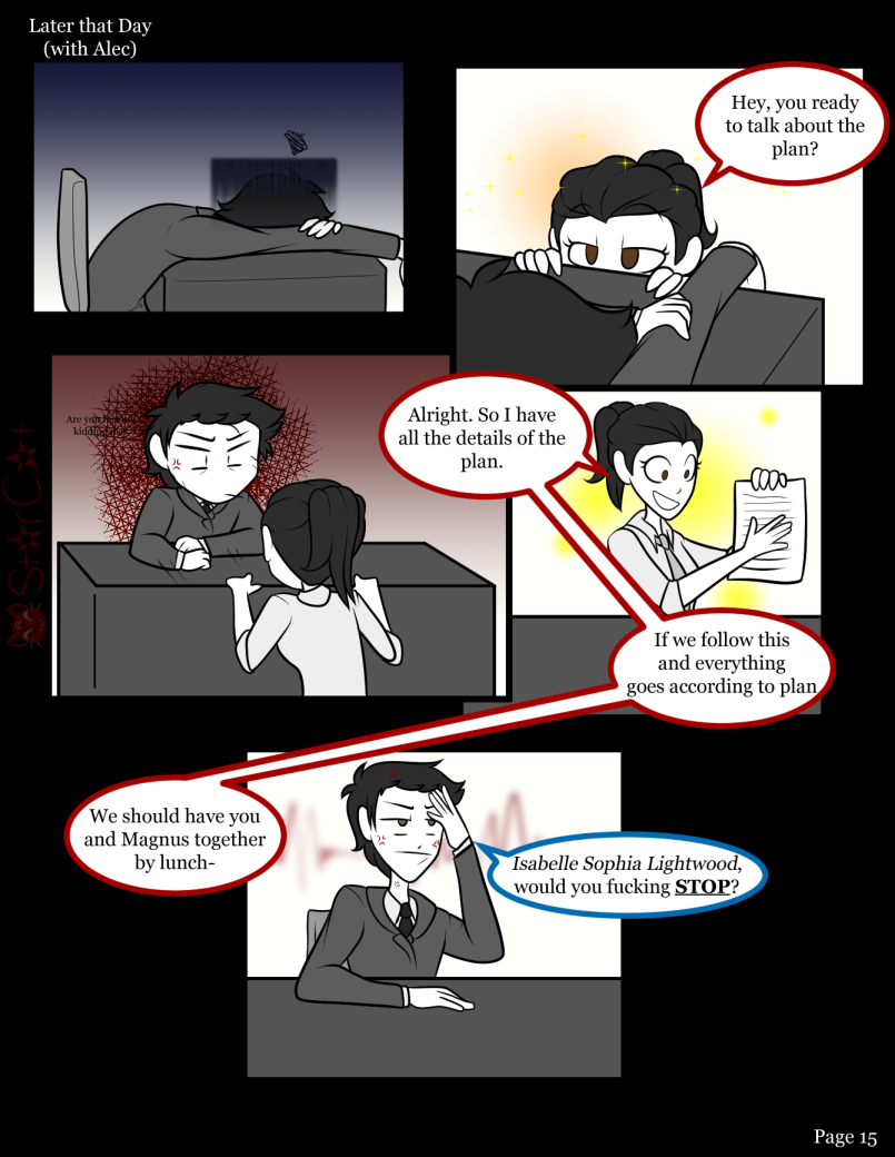 "You and Magnus together by lunch!" Quiet the plan Izzy! Once more your expression are just fabulous, love the use of color to convey the emotions of the characters!