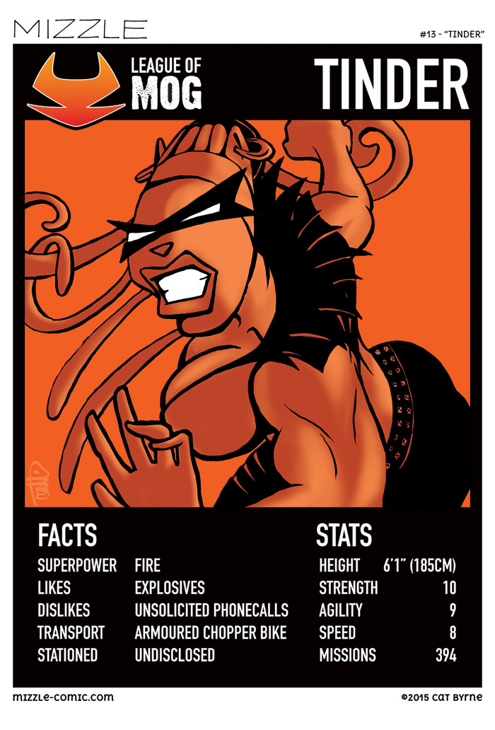 Mizzle's big sister, Tinder, as seen in the first of four "League of MOG" trading cards, complete with action superhero stats!