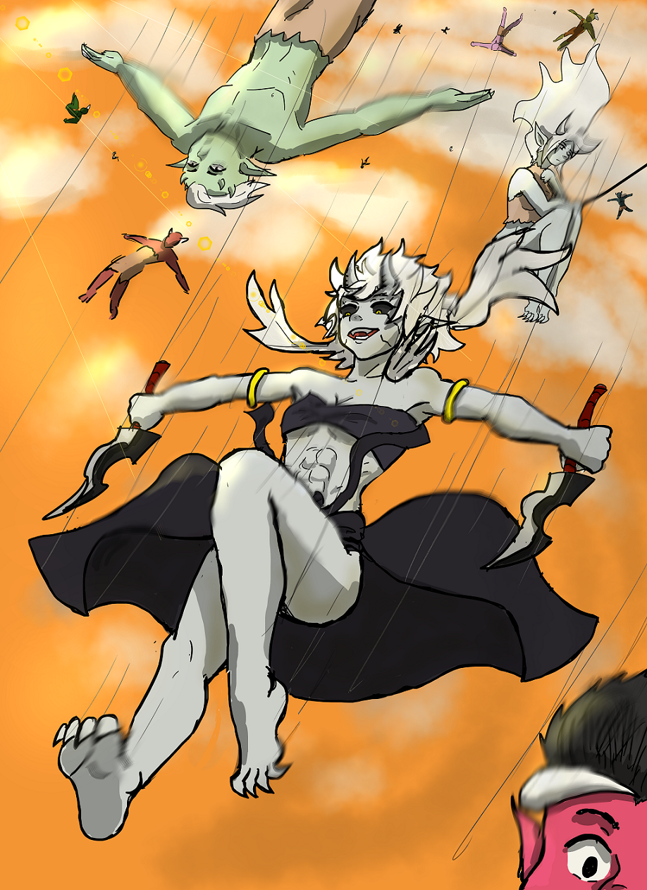 In a world under the assault of inmortal, powerful creatures known as Onis, two oni sisters, Rau and Azu, march towards the Capital in search of humans to eat. They soon become the prey of a relentless Demon Hunter and are forced to join a clan of their own kind to survive.