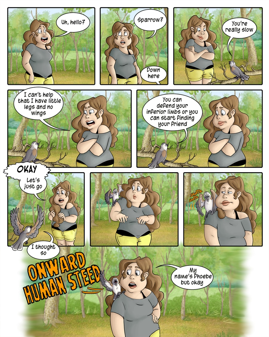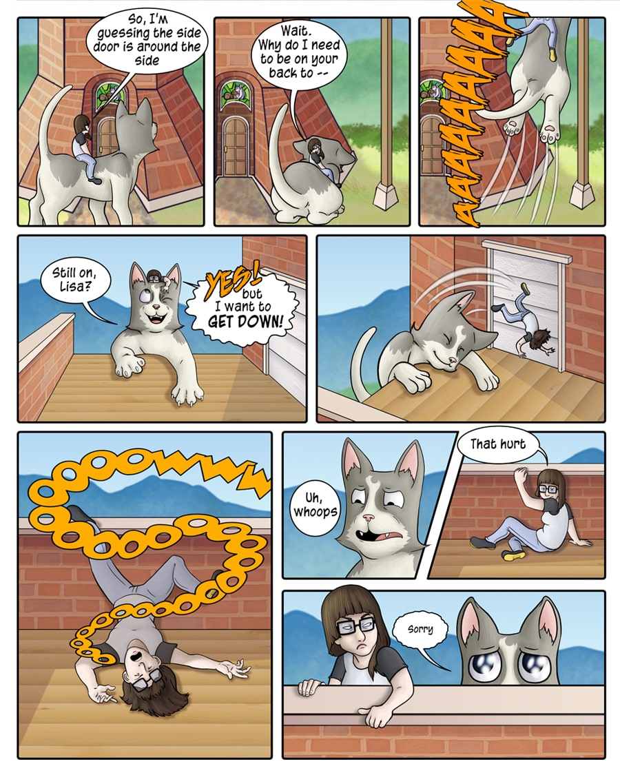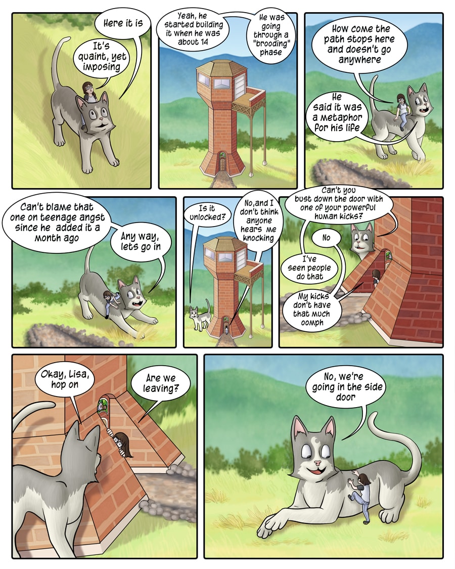 Lame Bread is a fantasy/adventure featuring Lisa, a girl who falls off a balcony onto a giant talking cat. Lisa soon finds herself in another world helping her new friends track down a WereCat and WereOtter who disappeared 20 years ago.