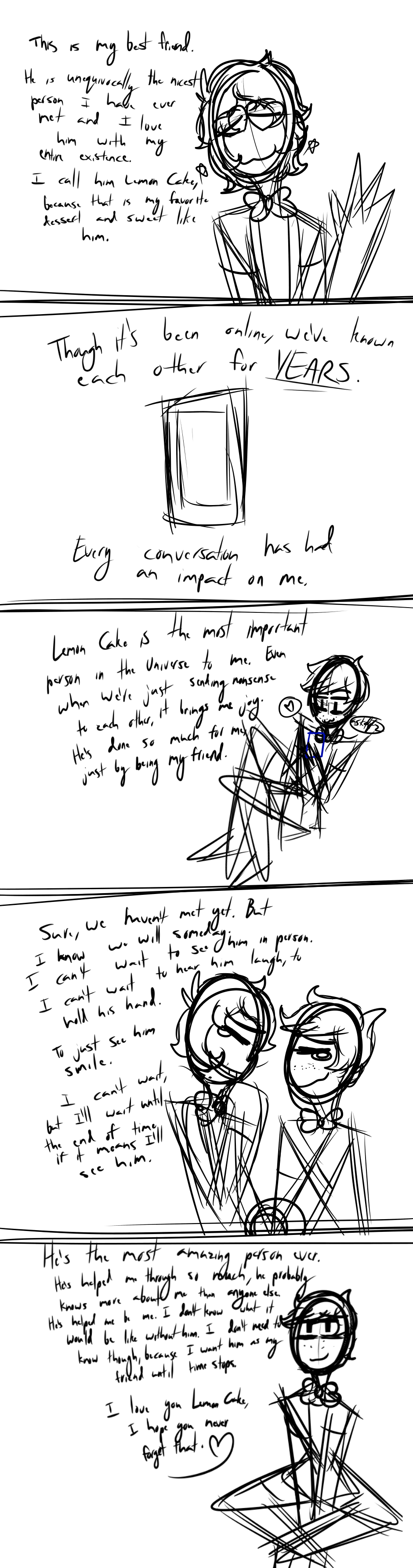Normally, this is where I’d give you advice. But instead I have something else, this episode is dedicated to my best friend. Without him, I certainly wouldn’t be the same person, I don’t know who I’d be but I know my life wouldn’t be as amazing without him. He’s helped me through so much, showed me so many interesting things and just been amazing. Even when he’s not knowingly helping me all the time, he helps when I’m falling apart. I know you already saw this comic lemon cake, but I hope you see this post of it too because I love you so much. You mean everything to me, from memes to advice. You make me talk a lot, so god damn much. I don’t even know how you do it, because I’m awful at conversations, but every time I think about you, I have a million words to say. Love you.