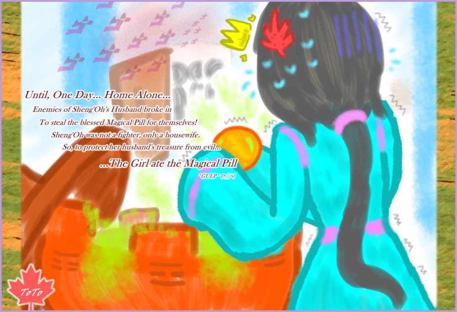 Sheng'Oh's Husband was a Master Archer, who had many disciples. When he went hunting on that fateful day, a jealous rival took this chance to steal the treasure... only for Sheng'Oh to swallow it...poor girl.