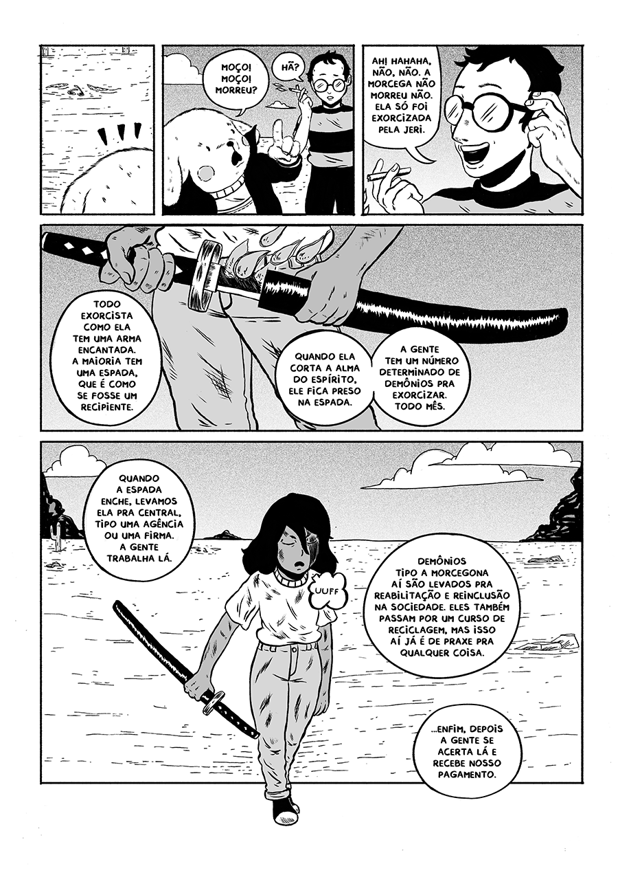 Numa fusão de aperreio e liseira, Jerimum uniu o não tão útil ao desagradável. Virou uma exorcista assalariada e agora ganha a vida expulsando a capirotagem nos quatro cantos do mundo. Junto com Baião, seu parceiro abestaiado, ela vai descer o sarrafo em tudo que é caramunhão para pagar as contas (e a merenda, se sobrar dinheiro).