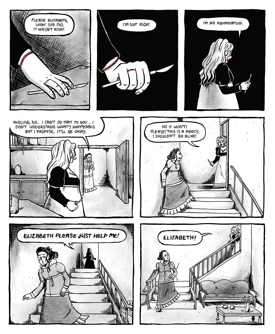 The Prometheite is a graphic novella reimagining Mary Shelley's Frankenstein as a lesbian tragedy. It follows the romance between Violet Schweitzer and Aveline Clerval, two young women in 19th century Ingolstadt.