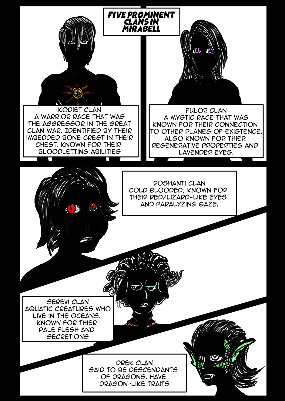 The Mirabell continent was once a bustling medieval continent filled with a great diversity of races, known as “clans.” These clans had special traits that elevated them above the humans, giving them an edge. Humans as “traitless” were generally treated as slaves, or did simple tasks in villages, some humans were treated fairly by some clans, though a good portion were treated horribly. A great war was urged on by the devilish new leader of the Kodiet clan, Brayden who initiated a mass genocide of the other clans,thus reducing the once-great diversity of clans to only five: Kodiet, Roshanti, Fulor, Serevi, and Drek. As The Great War reached its climax, humans returned to the scene and regained control of the world after detailed study of the aggressive clans and their weaknesses. A group of 12 humans wiped out the most violent clans, the Kodiet and Roshanti, in one night, and were forever celebrated as The 12 Heroes of Legend. The Fulor, Serevi and Drek clans were allowed to retreat and continue their lives separately, though regulations were put in place to ensure they stayed in their own encampments. The city of Syaso was reinvented as the hub for human government, also becoming their major working capital, and a council of nobility was swiftly established to rule the lands. This new regime has only been in place for 14 years.