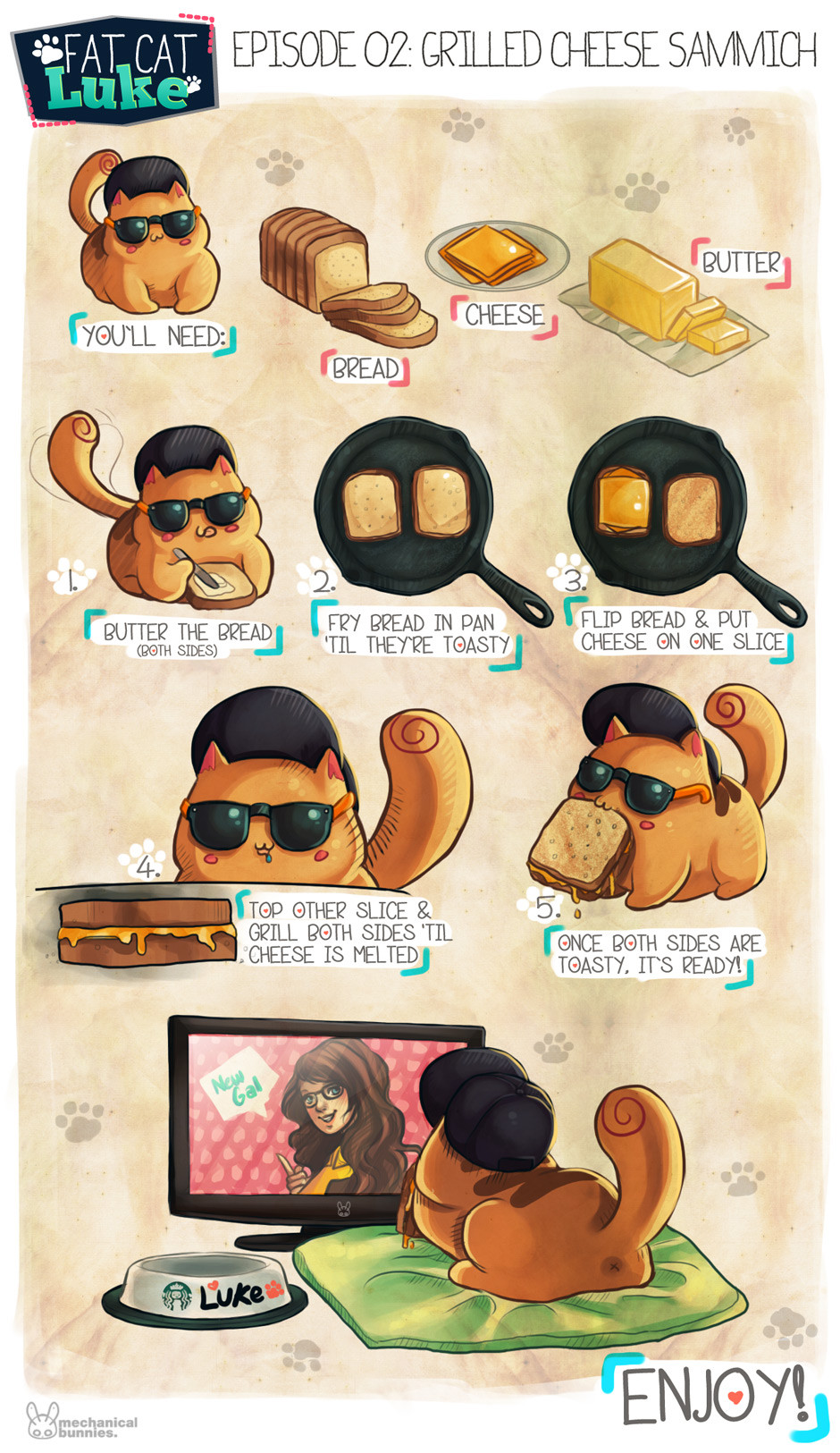 First official episode other than the intro! :3 Fat Cat Luke likes to watch sitcoms. But before he gets settled into his shows, he always makes something to snack on! Today he was in the mood for a grilled cheese sandwich...